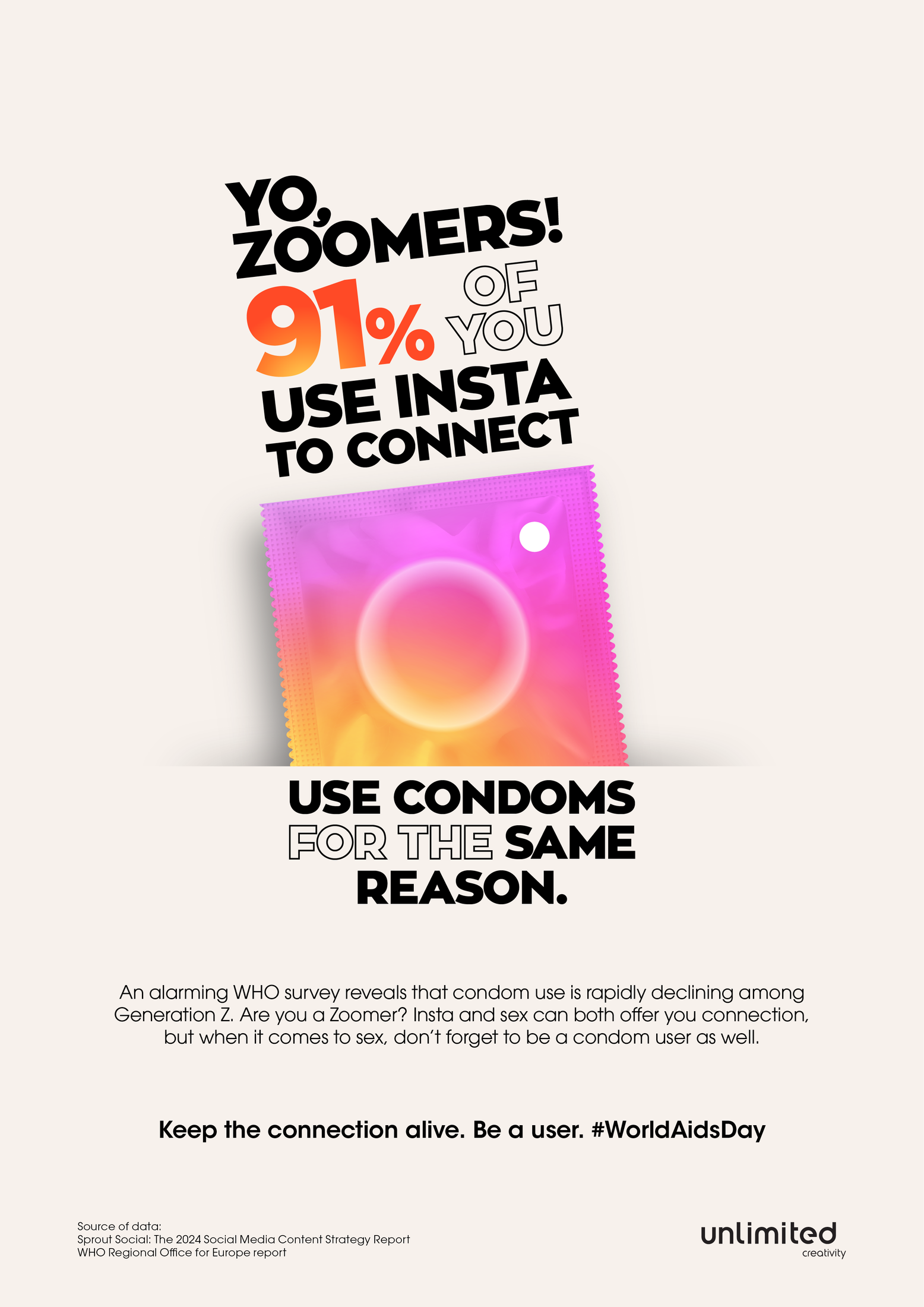 “Be a condom user,” a World AIDS Day campaign created by Unlimited Creativity Agency, aims to address the concerning drop in condom use among Generation Z. The campaign reminds Zoomers that they use social media for entertainment, pleasure, and interaction—just as they should with condoms. The message is clear: “Are you a Zoomer? Be a condom user!” By utilizing recent data from WHO and Sprout Social, the campaign lets the numbers do the talking. It emphasizes that safe sex can be as enjoyable and empowering as the other things Gen Z values: connection, fun, and entertainment. The goal of this positive campaign is to encourage Gen Z to live life to the fullest and take control of their health.