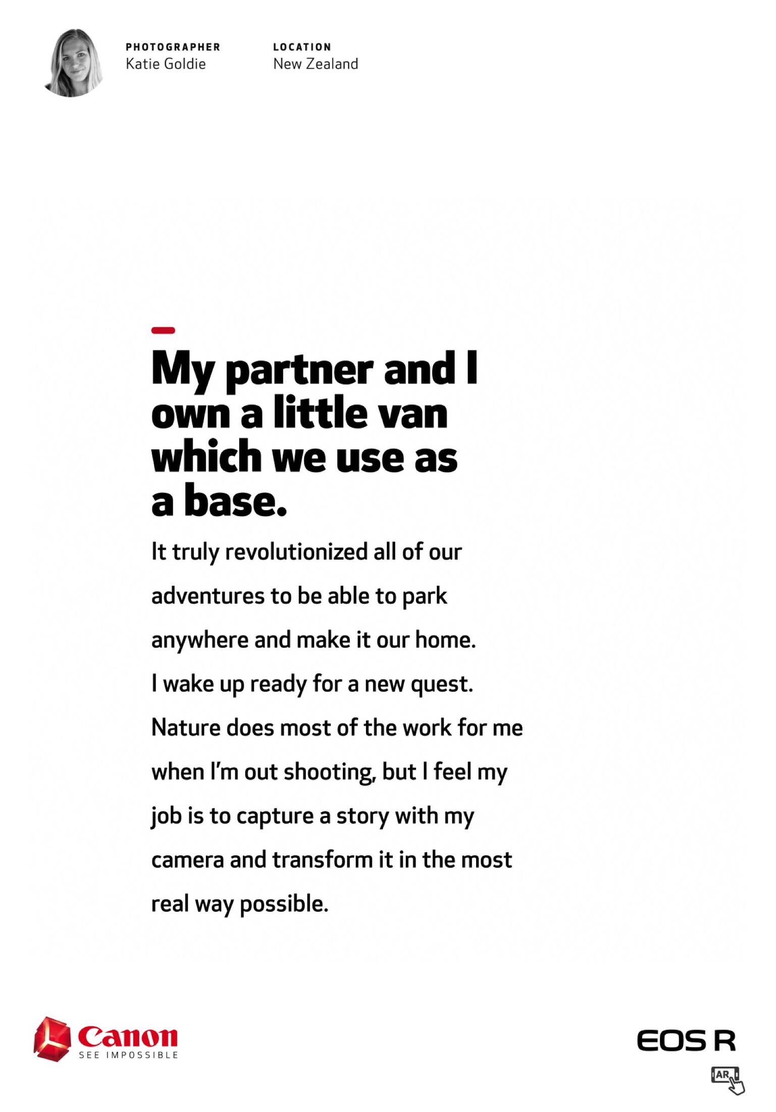 Canon's biggest launch in years for the EOS R mirrorless camera. We invited big photographers like Jimmy Chin and Lindsay Adler to express what being the revolution meant to them. Other ads with influencers were AR activated, telling the story behind each photo.