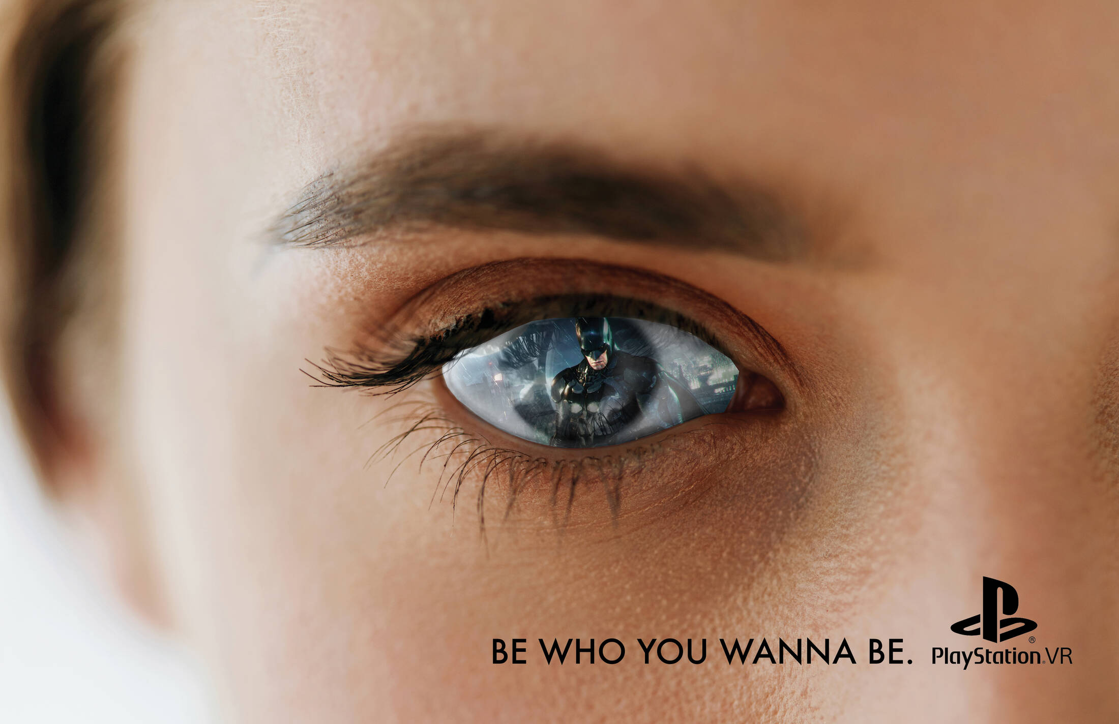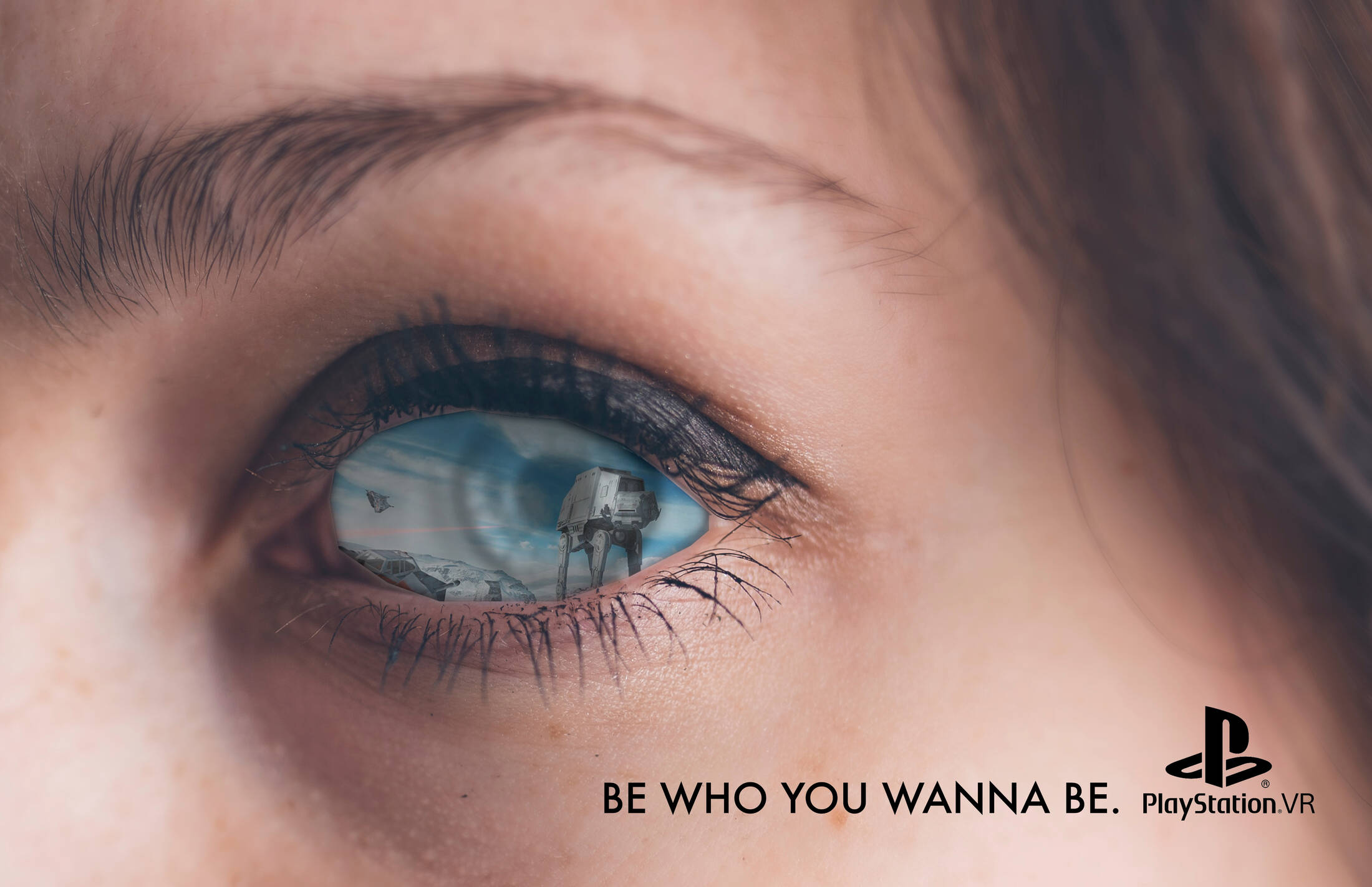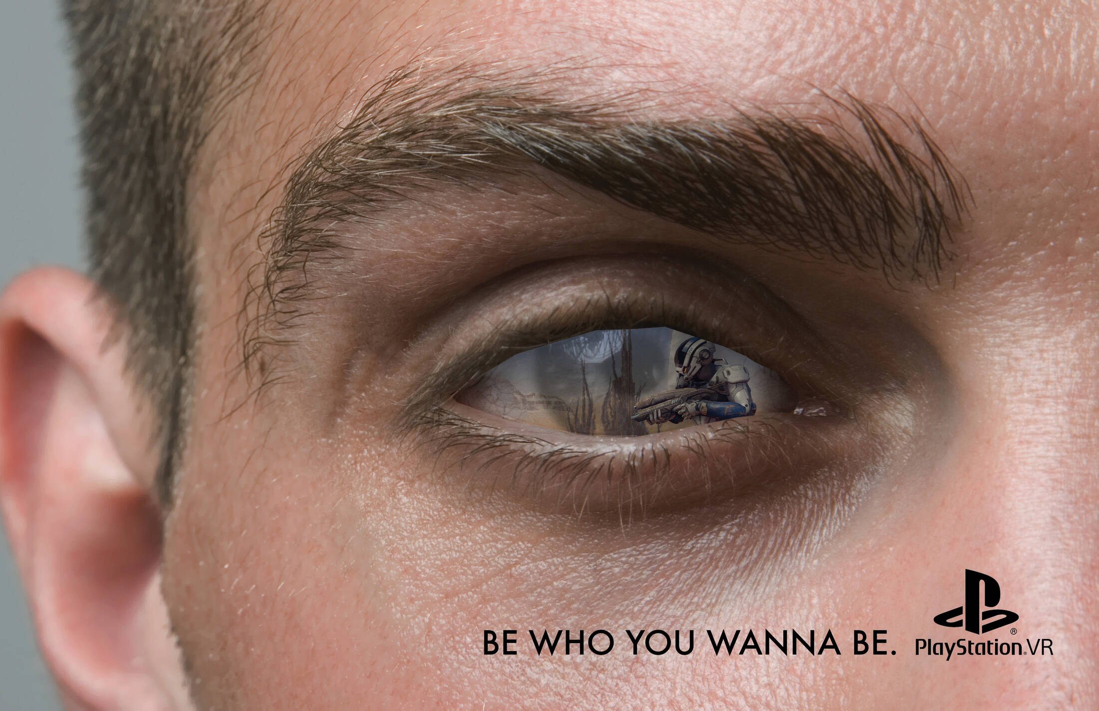 PlayStation VR emphasizes its product benefit as being the most immersive gaming environment. In this ad, the game station is embedded in the eye of the user. Together, the game and the user can achieve the benefits of virtual reality.