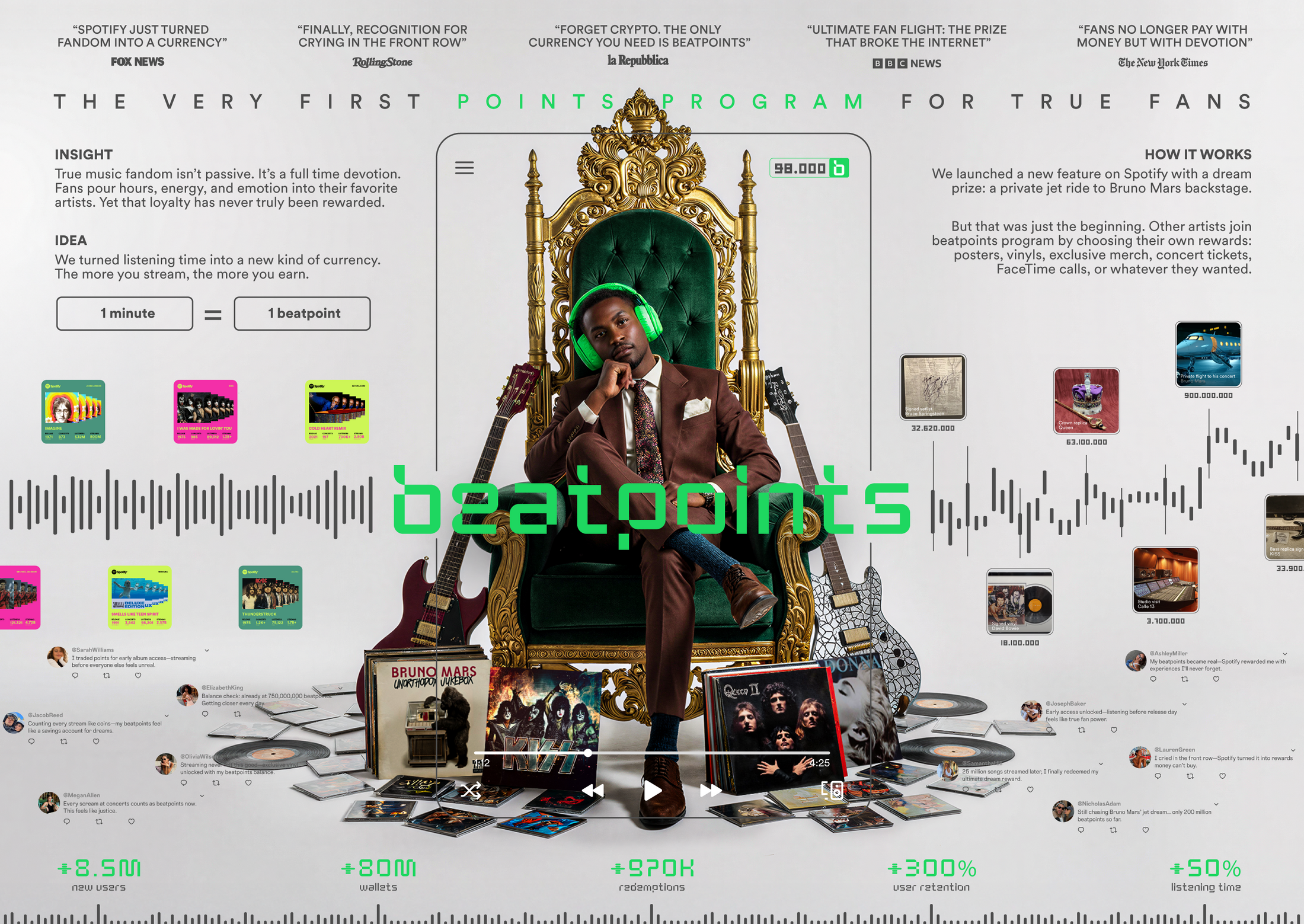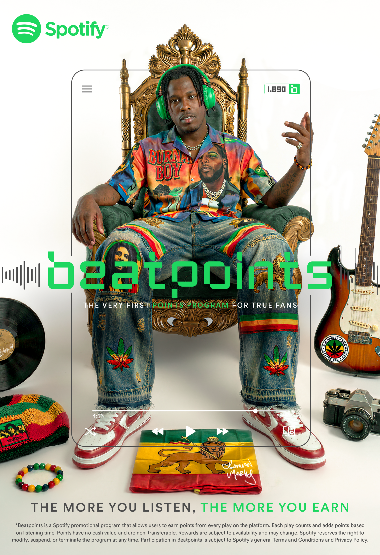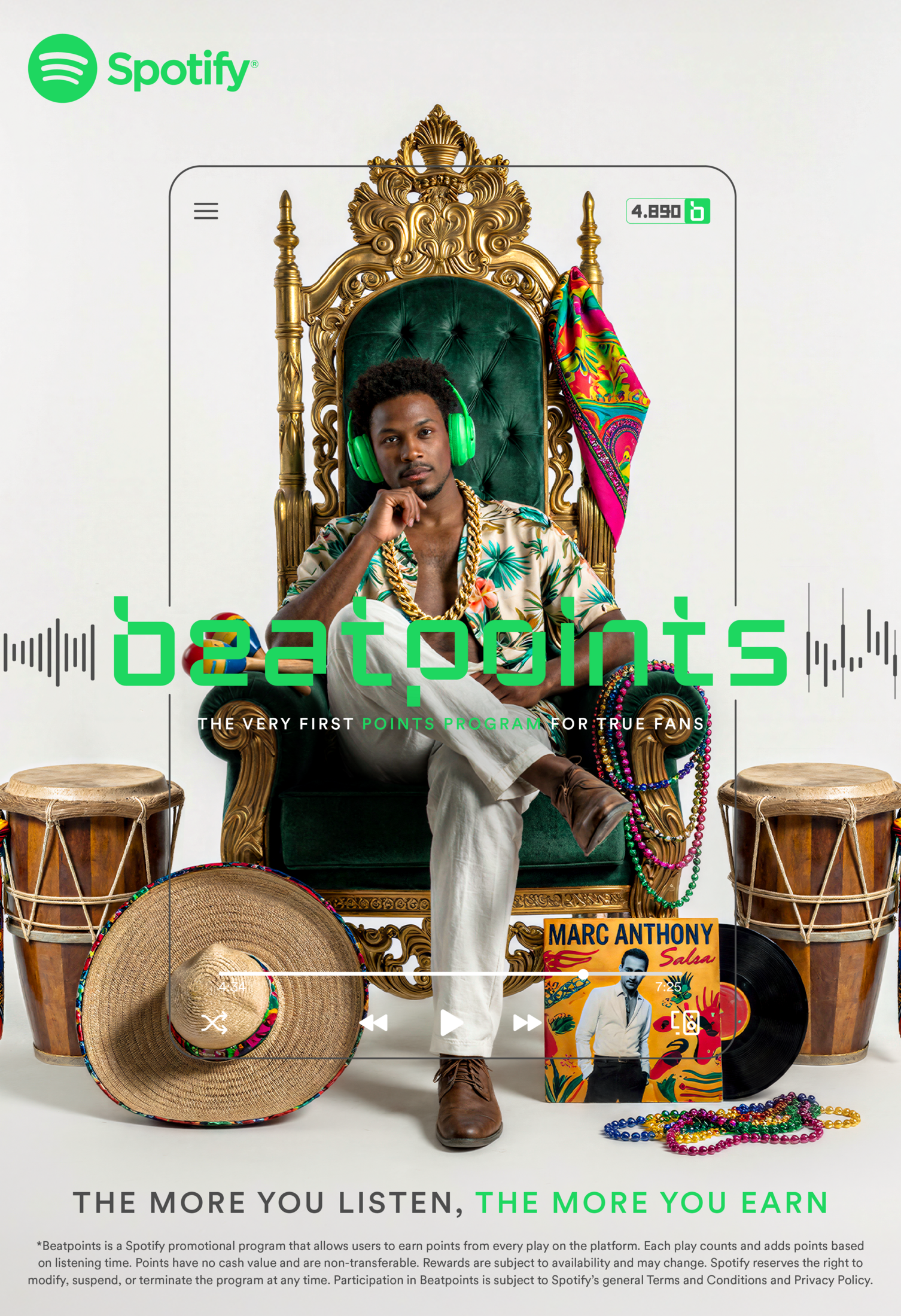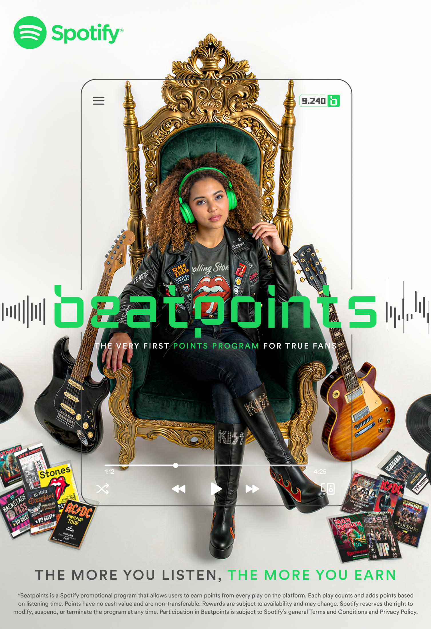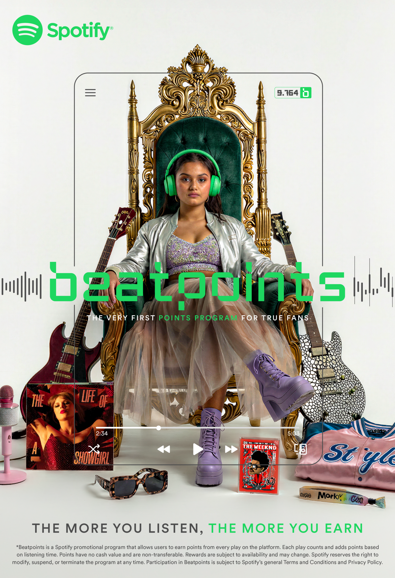 With Beatpoints, Spotify turns listening time into a new kind of currency. Every minute streamed equals 1 Beatpoint—the more you listen, the more you earn. For the first time, listening to music doesn’t just feel good, it adds up and can be redeemed for unique experiences, from exclusive merch and concert tickets to once-in-a-lifetime moments with the artists themselves.