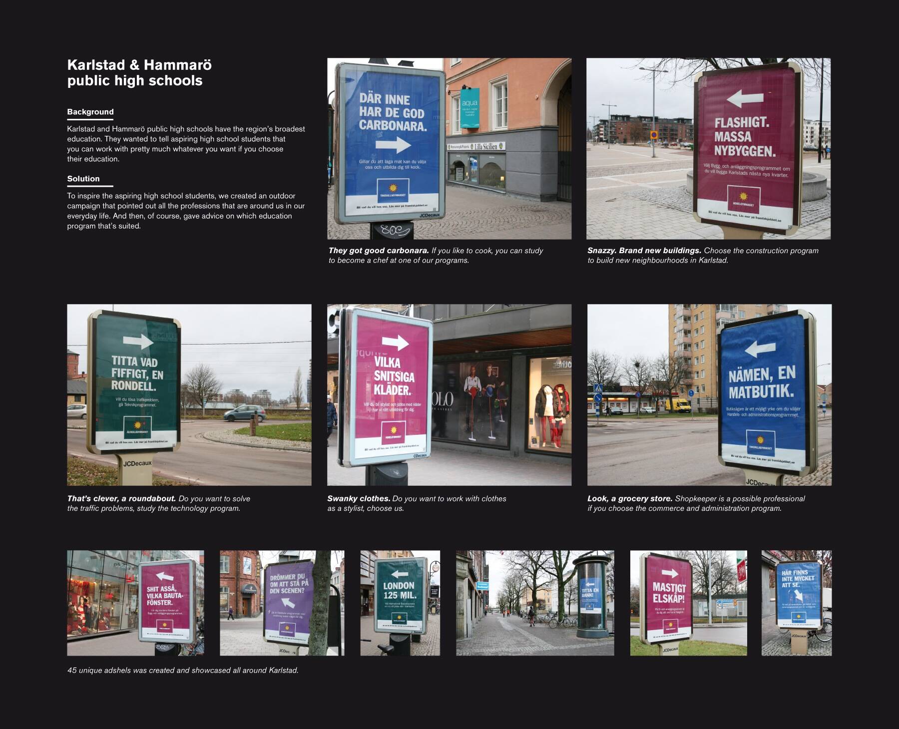 This professional campaign titled 'Become whatever you want' was published in Sweden in November, 2012. It was created for the brand: Karlstad & Hammarö public high schools, by ad agency: Spenat. This OOH Outdoor medium campaign is related to the Public Interest industry and contains 1 media asset. It was submitted over 12 years ago.