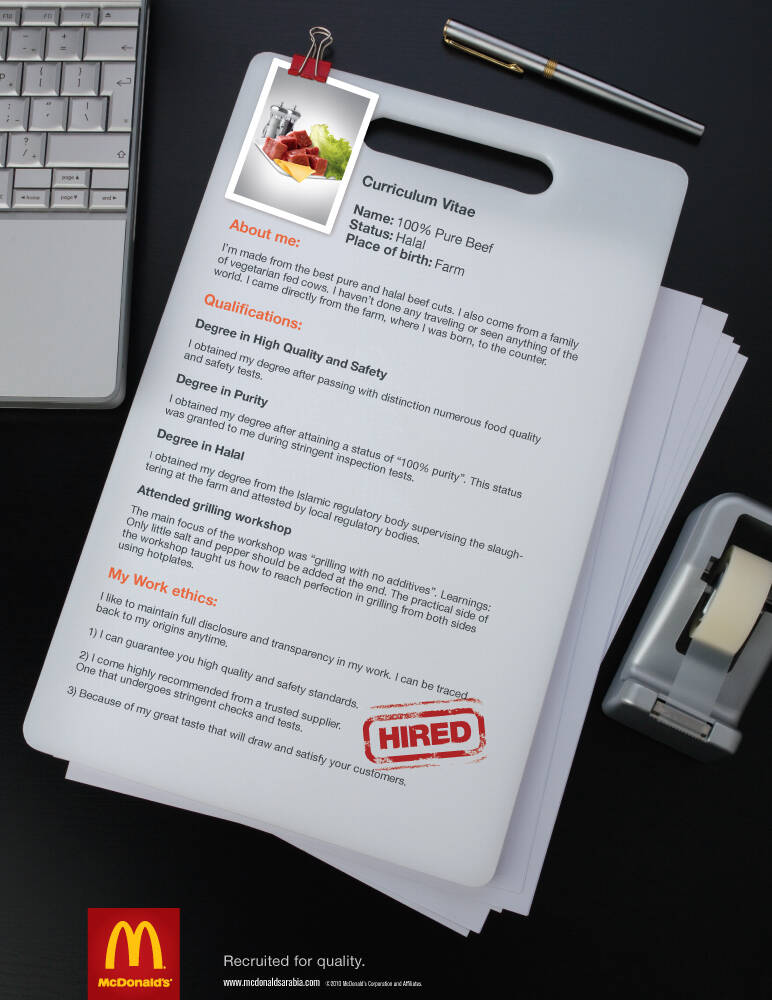 This professional campaign titled 'Beef CV, Tomato CV, Potato CV, Lettuce CV, Chicken CV' was published in United Arab Emirates in October, 2010. It was created for the brand: McDonald's, by ad agency: FP7. This Print medium campaign is related to the Food industry and contains 5 media assets. It was submitted about 15 years ago.