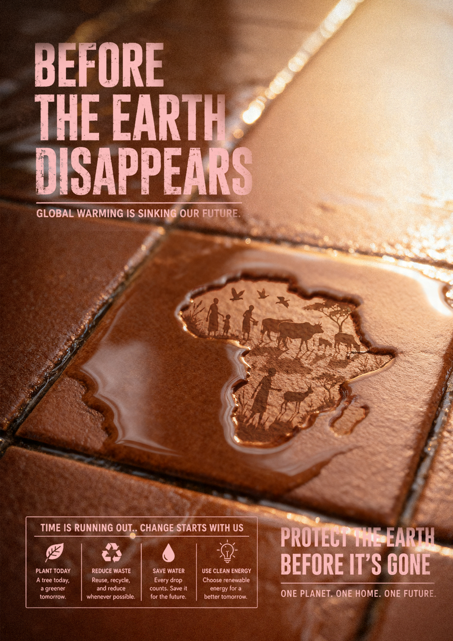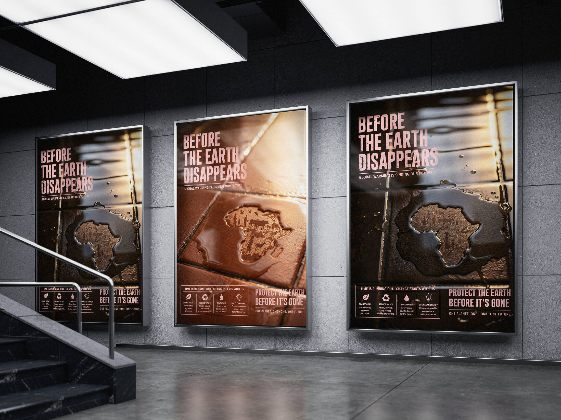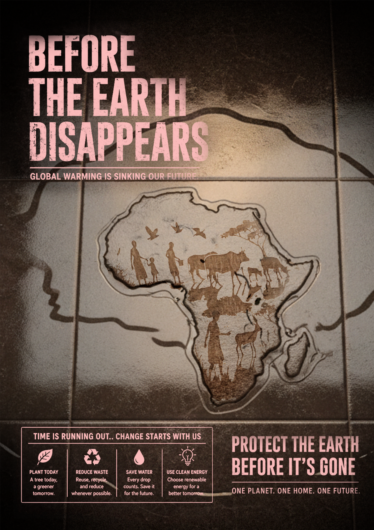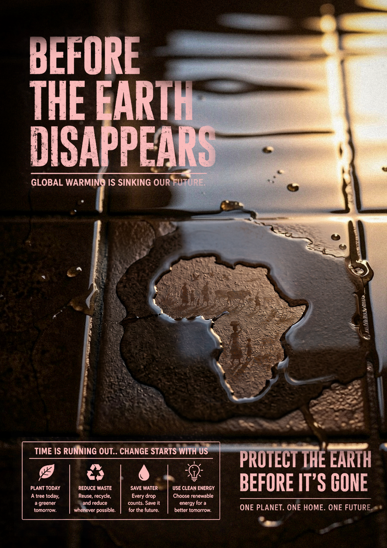 Before The Earth Disappears Global Warming Is Sinking Our Future Campaign Description: A visual OOH campaign that transforms the African continent into a powerful metaphor for climate loss. The concept places Africa — etched into cracked, dry earth, alive with silhouettes of people, cattle, and wildlife — surrounded by rising water that slowly swallows everything, leaving no trace behind. The message is simple and devastating: if we don't act now, entire civilizations, ecosystems, and ways of life will be erased — not gradually, but completely. Seven executions explore different surfaces, textures, and lighting — from flooded tile to dry desert soil — each telling the same urgent story from a different angle. The campaign closes with one call to action: Protect the Earth Before It's Gone. One Planet. One Home. One Future. Credits: Art Direction & Visual Design Campaign Theme: Climate Change Awareness Category: Environmental / Social Impact
