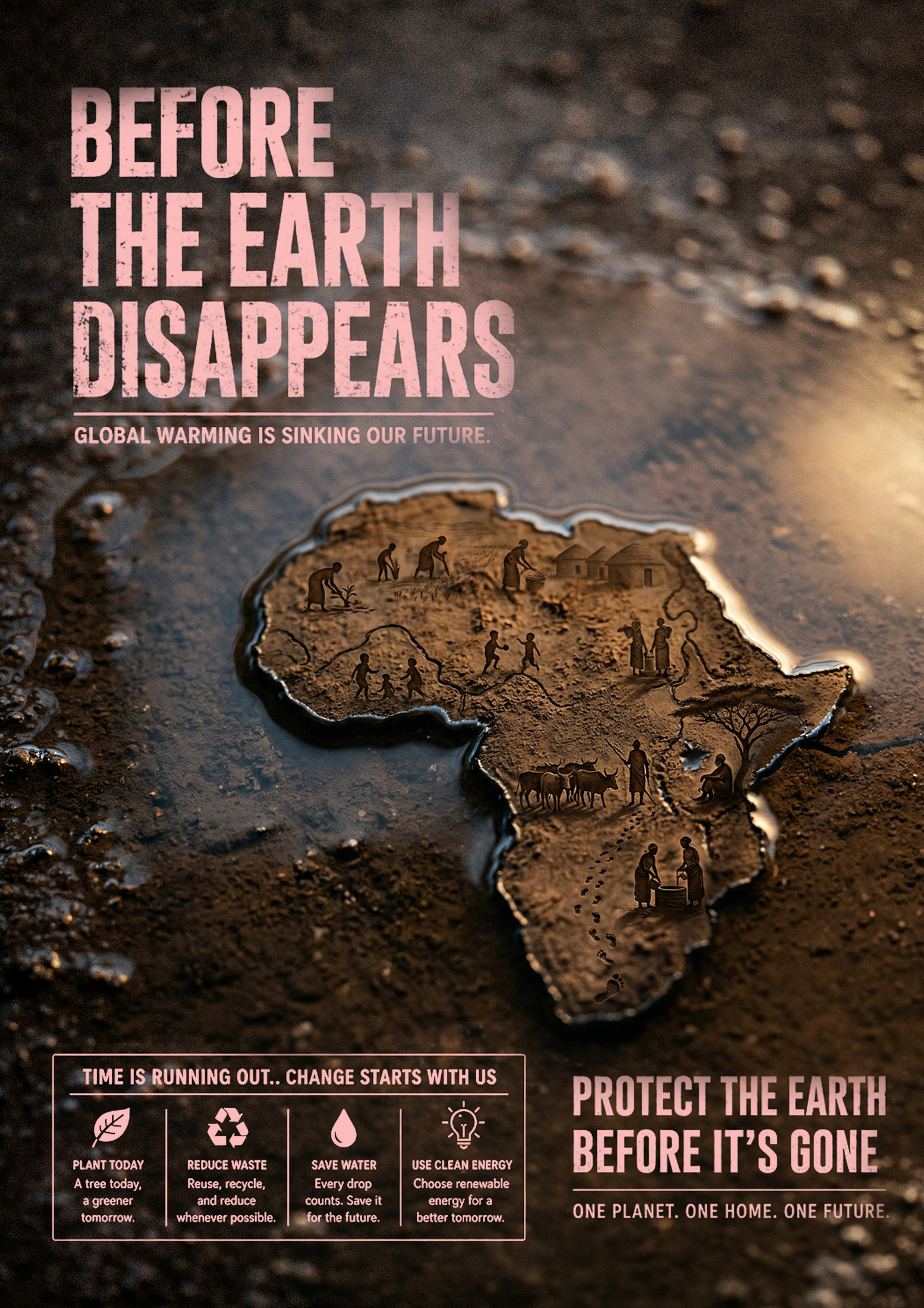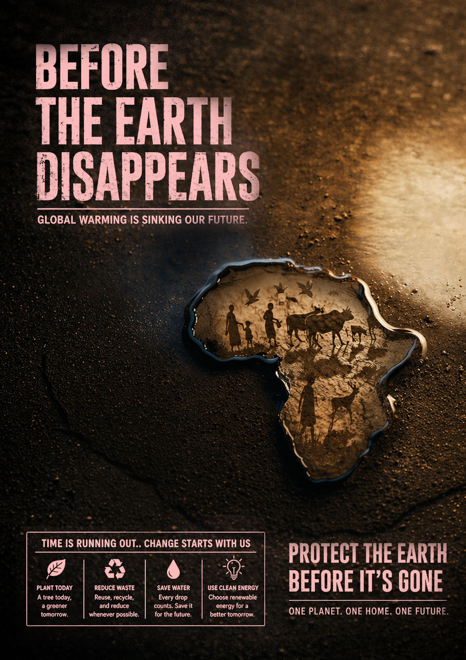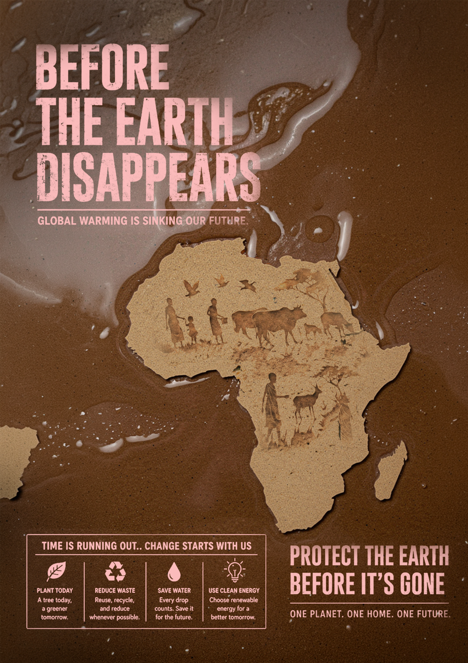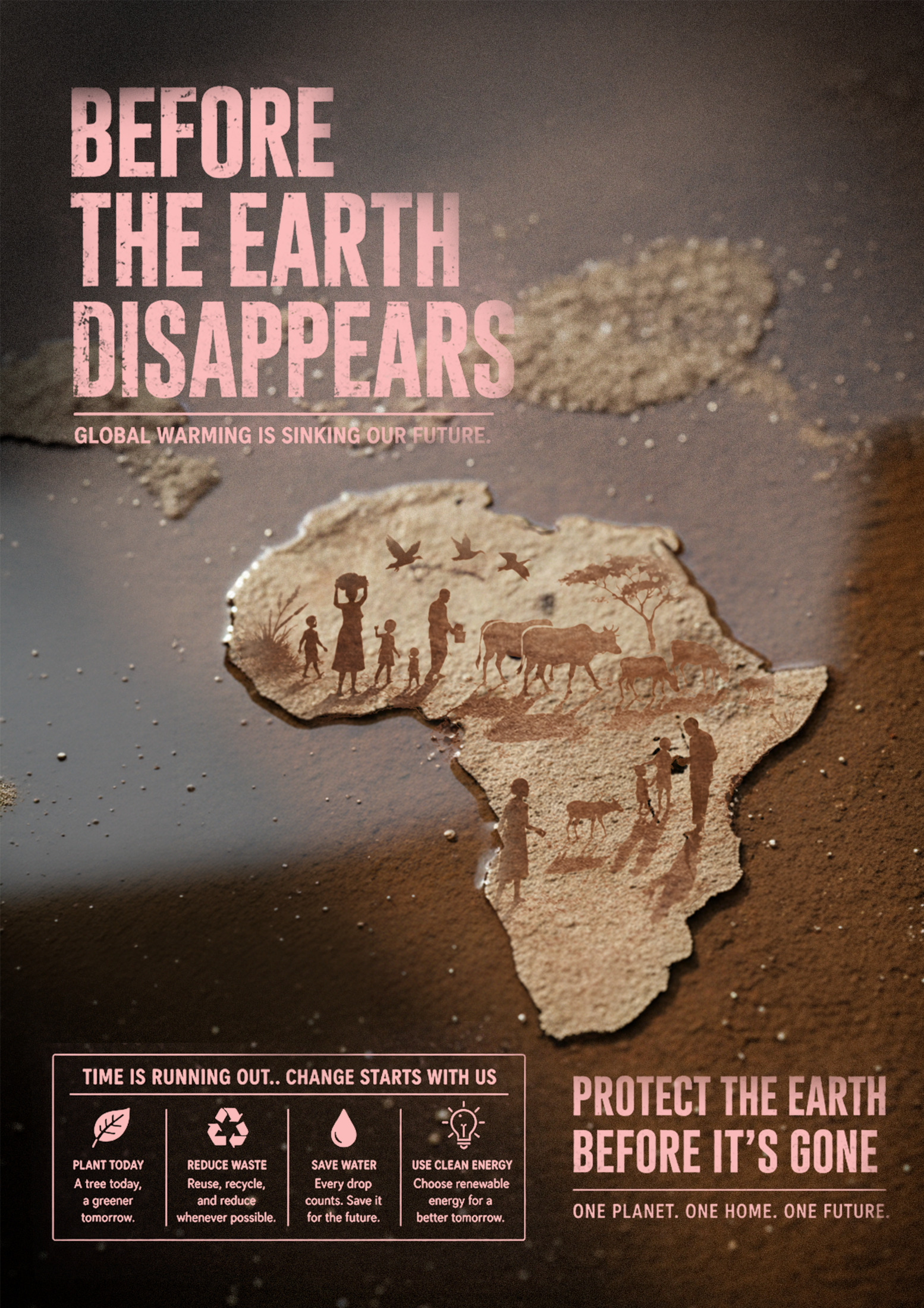 Before The Earth Disappears Global Warming Is Sinking Our Future Campaign Description: A visual OOH campaign that transforms the African continent into a powerful metaphor for climate loss. The concept places Africa — etched into cracked, dry earth, alive with silhouettes of people, cattle, and wildlife — surrounded by rising water that slowly swallows everything, leaving no trace behind. The message is simple and devastating: if we don't act now, entire civilizations, ecosystems, and ways of life will be erased — not gradually, but completely. Seven executions explore different surfaces, textures, and lighting — from flooded tile to dry desert soil — each telling the same urgent story from a different angle. The campaign closes with one call to action: Protect the Earth Before It's Gone. One Planet. One Home. One Future. Credits: Art Direction & Visual Design Campaign Theme: Climate Change Awareness Category: Environmental / Social Impact