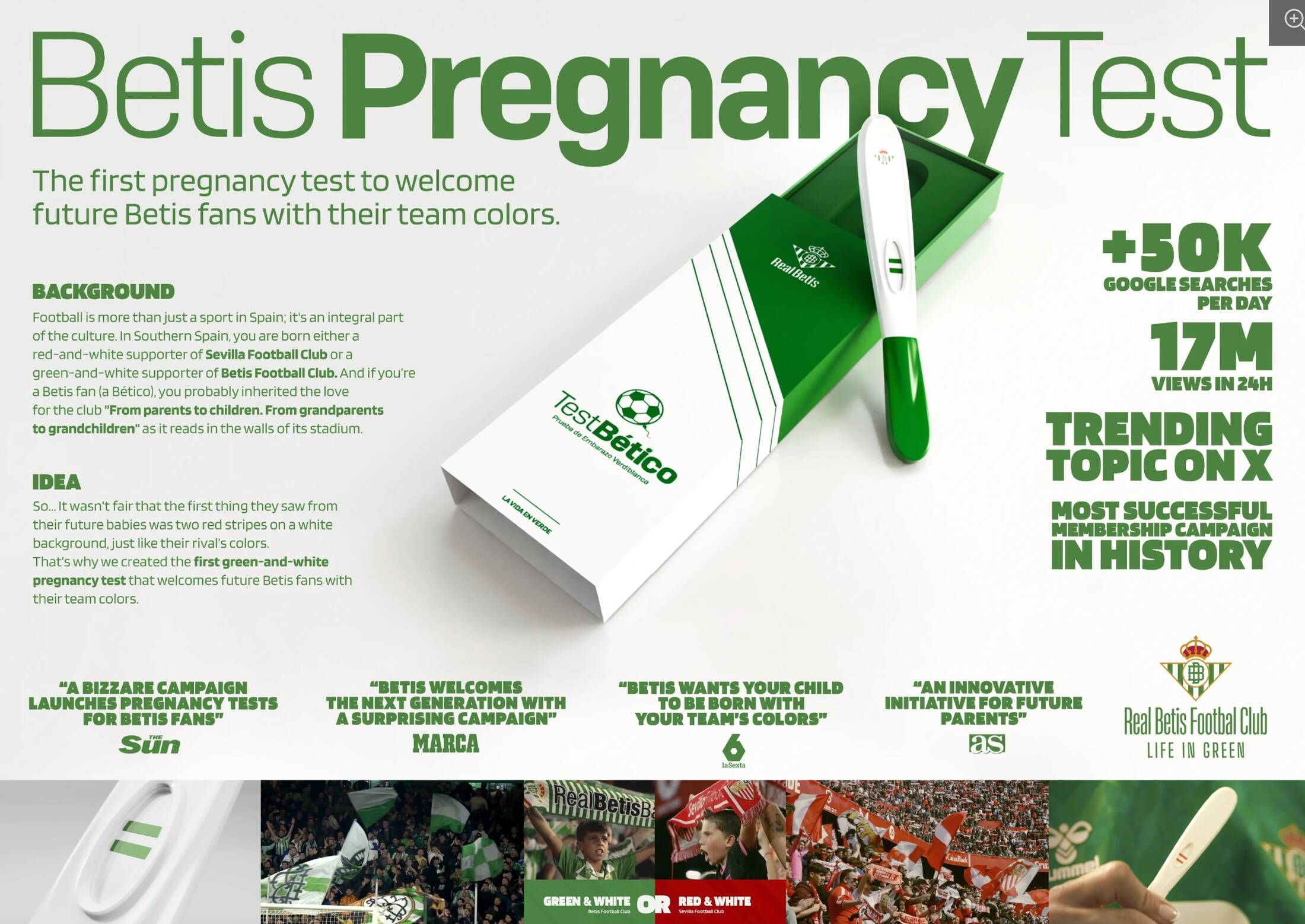 The brief was to develop an innovative concept that would resonate with the existing fans while also appealing to potential new ones. The idea had to reflect the unique cultural context of football fandom in Spain, particularly the intense sentiment. The primary goal was to drive membership sign-ups. Additionally, we aimed to generate buzz around the campaign, strengthen the club's brand image, and foster a stronger sense of community among fans. IDEA The Real Betis Football Club's yearly membership campaign redefined the notion of being "born not made" by creating the world's first green-and-white pregnancy test. This innovative idea stemmed from the insight that our fans' love for the club is inherited - passed down through generations. We turned a universal symbol of birth, typically represented in Sevilla FC's colors: red and white, into a unique symbol of allegiance to Real Betis. By tapping into the deep-seated rivalry and cultural significance of football club colors in Spain, we stirred attention and conversation among our target audience. The green-and-white pregnancy test was not just a product but a statement against the norm, directly challenging the red-and-white color convention. It was designed to resonate with passionate fans, reaffirming their loyalty while inviting them to pass on their love for Real Betis to the next generation.