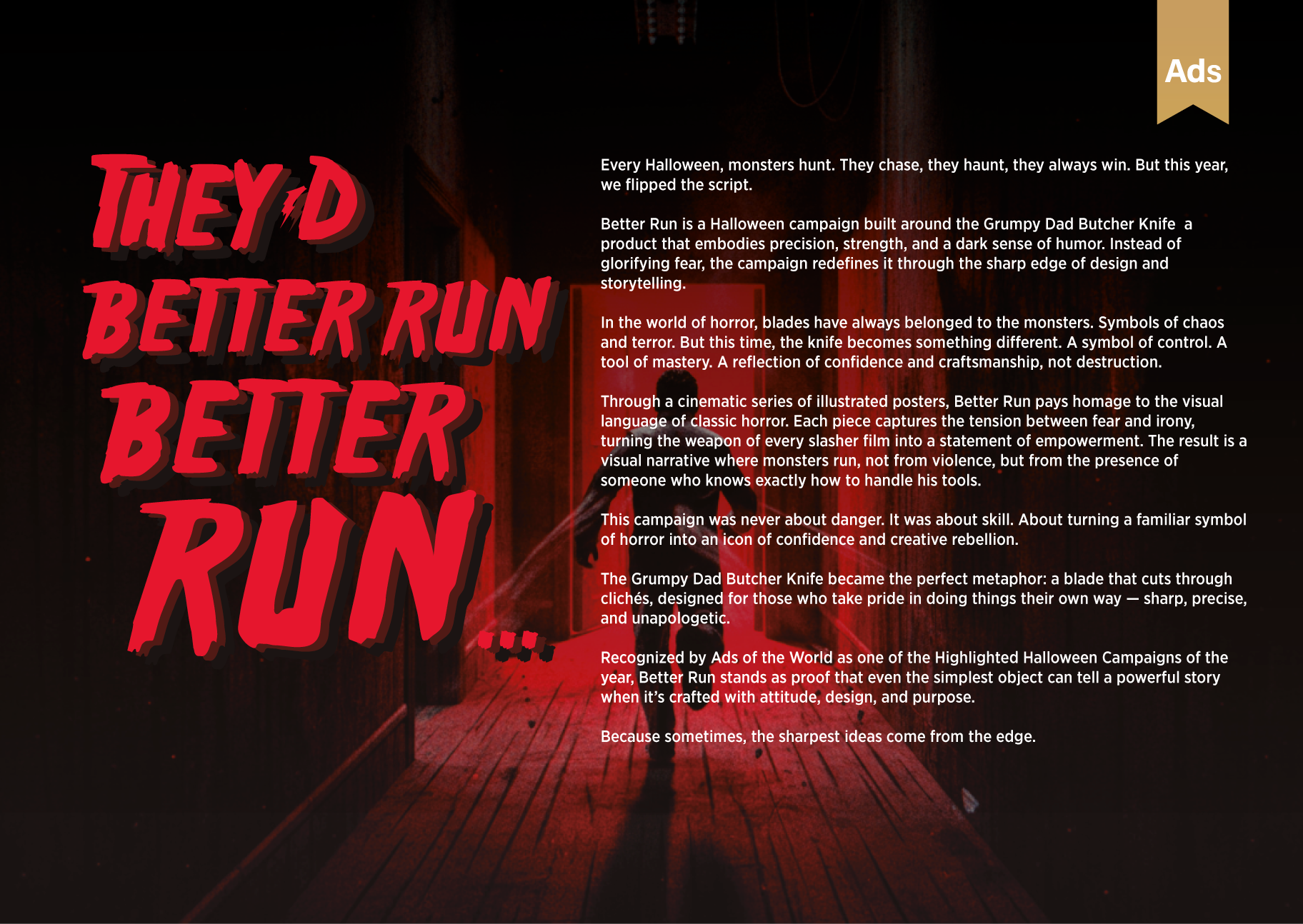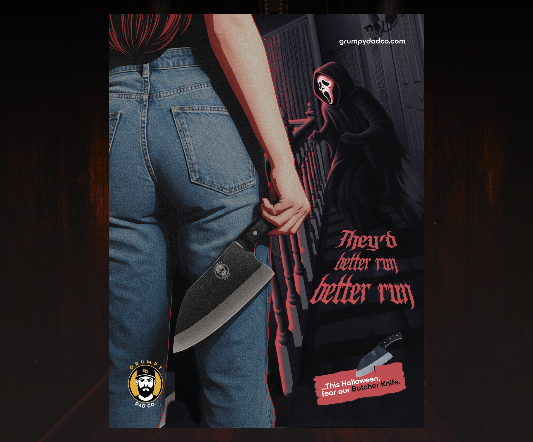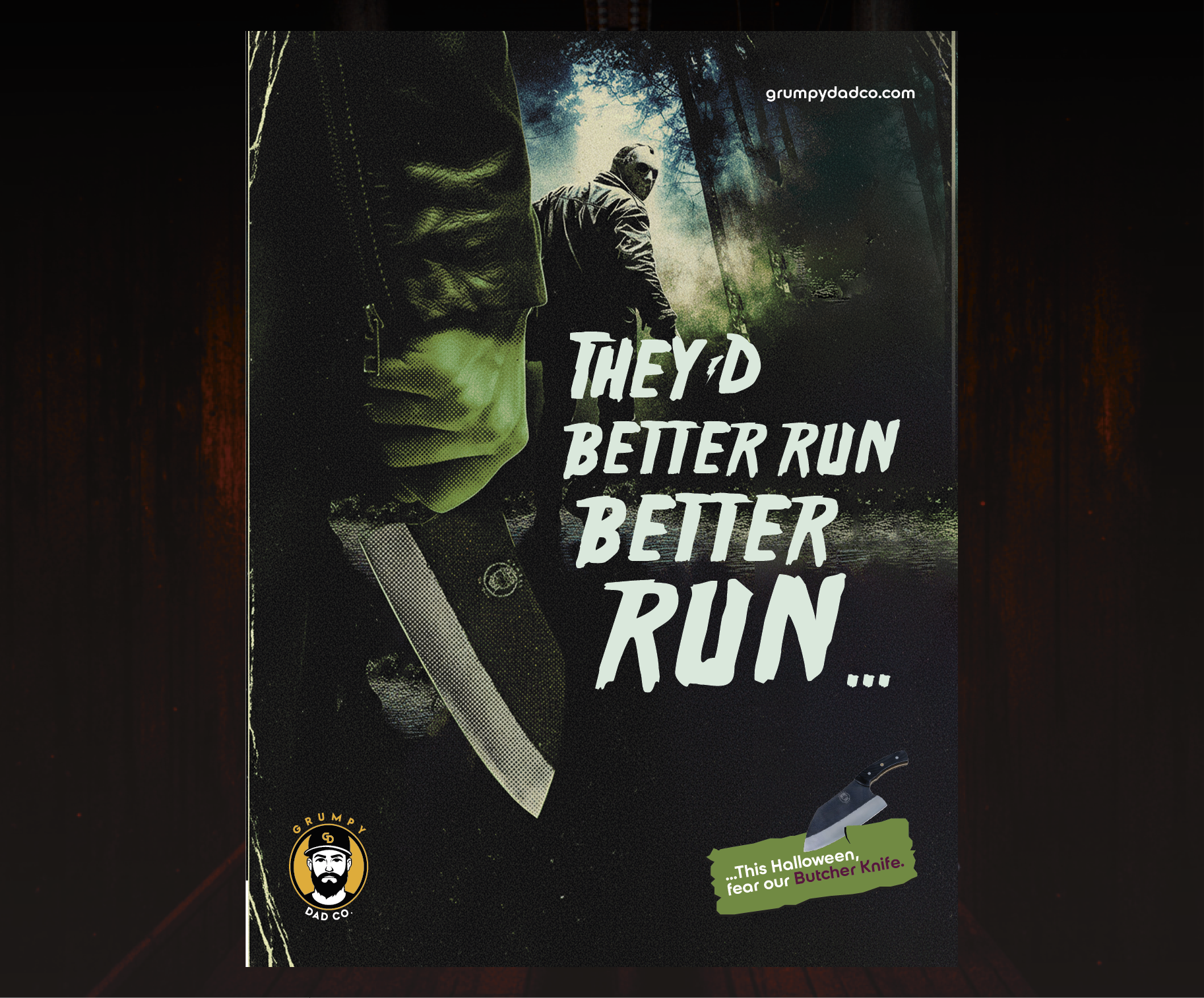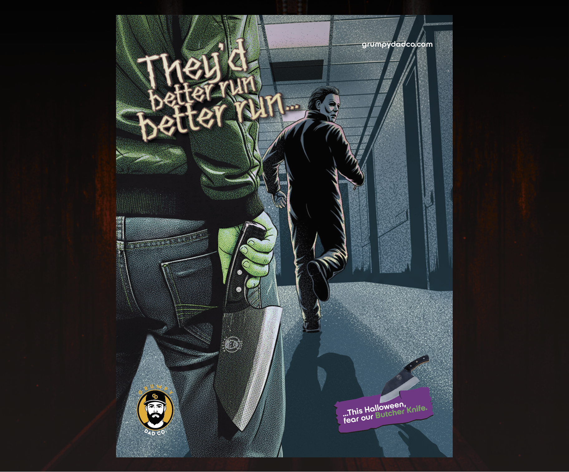This Halloween campaign flips the classic horror script — the monsters are the ones running. The Better Run series portrays iconic horror villains fleeing from the Grumpy Dad Butcher Knife, blending humor and cinematic nostalgia. Inspired by vintage slasher posters, each artwork combines retro illustration and comic-book grit to highlight the knife’s bold design and attitude. The tagline “They’d better run, better run…” captures the confident spirit of Grumpy Dad Co., turning a kitchen tool into a pop-culture hero for dads who take cooking seriously.