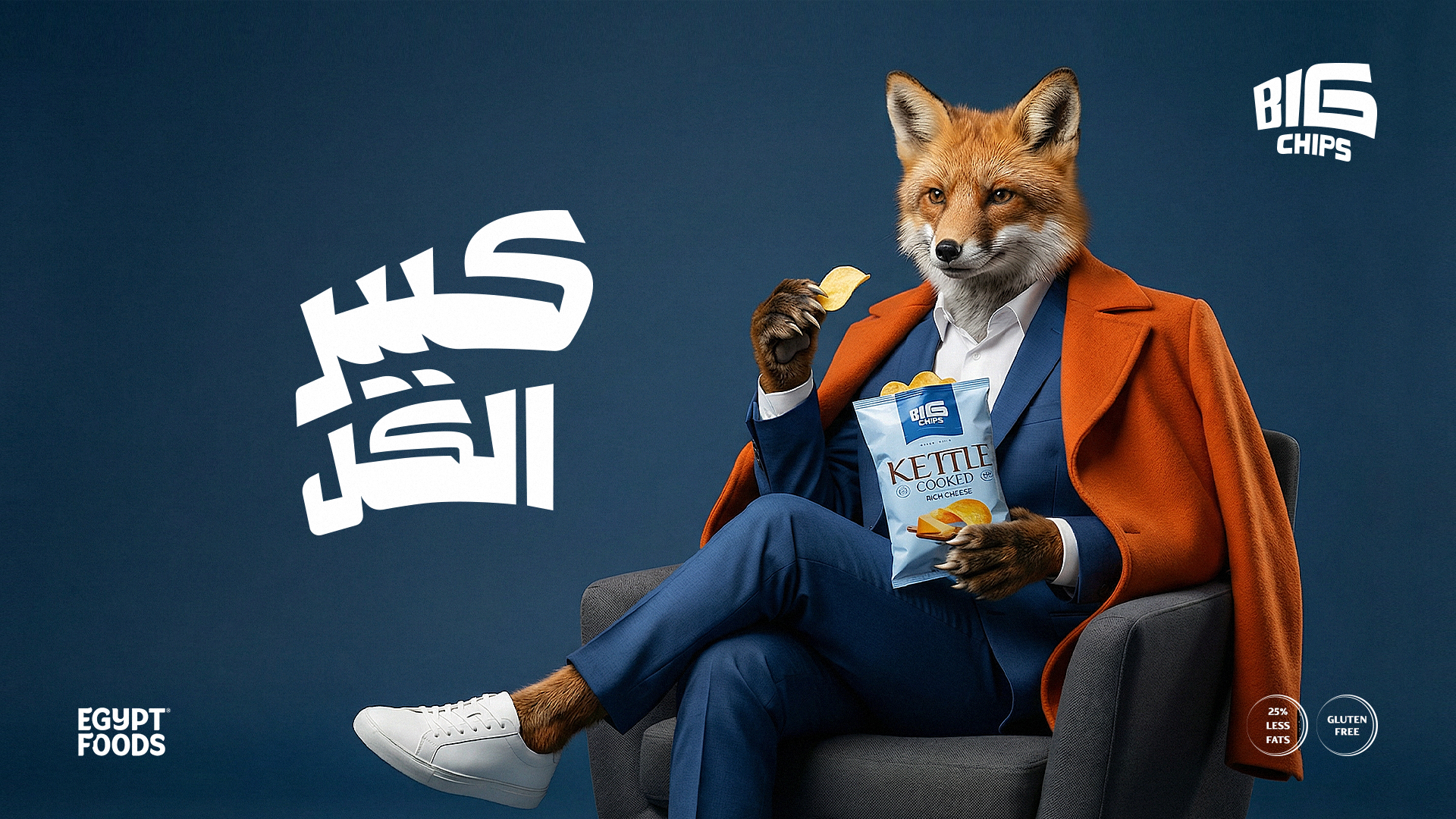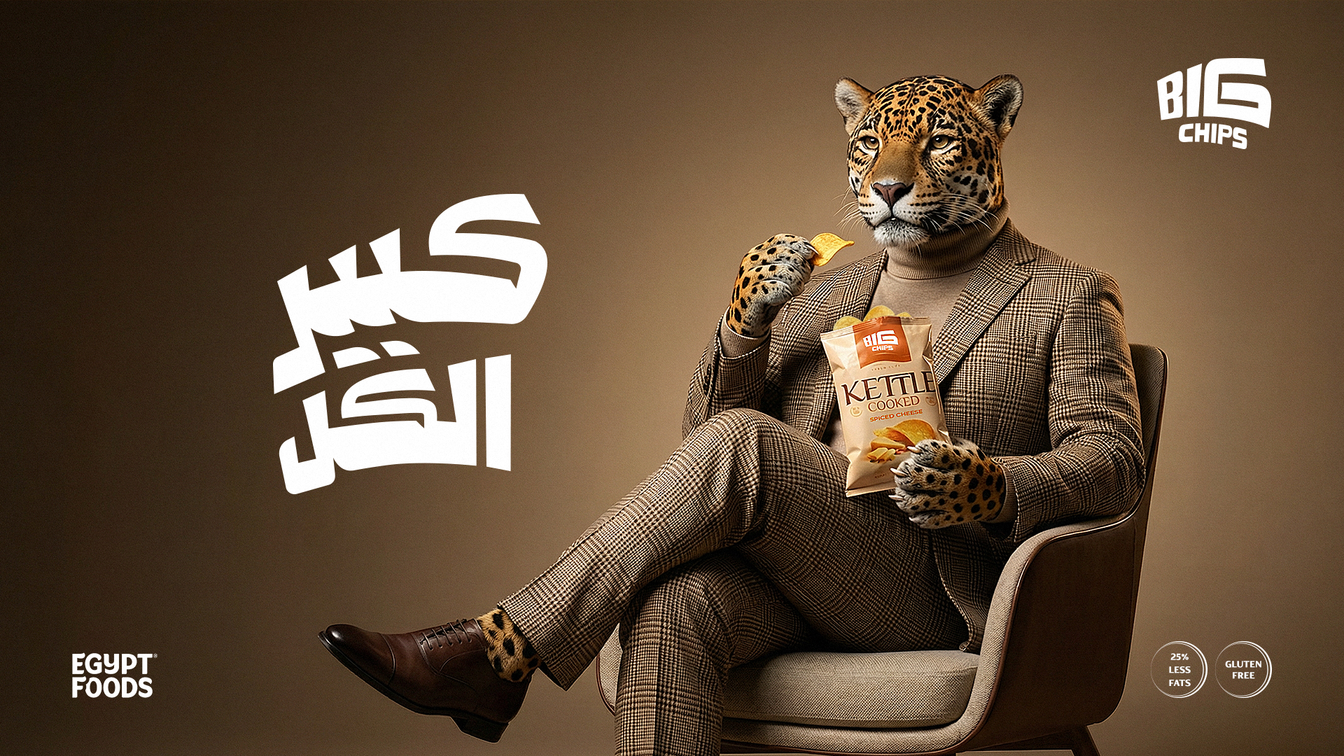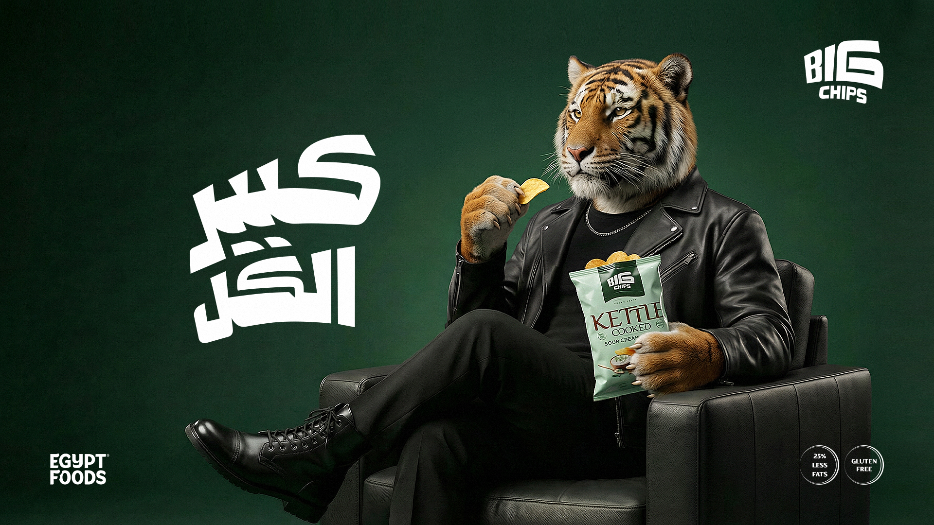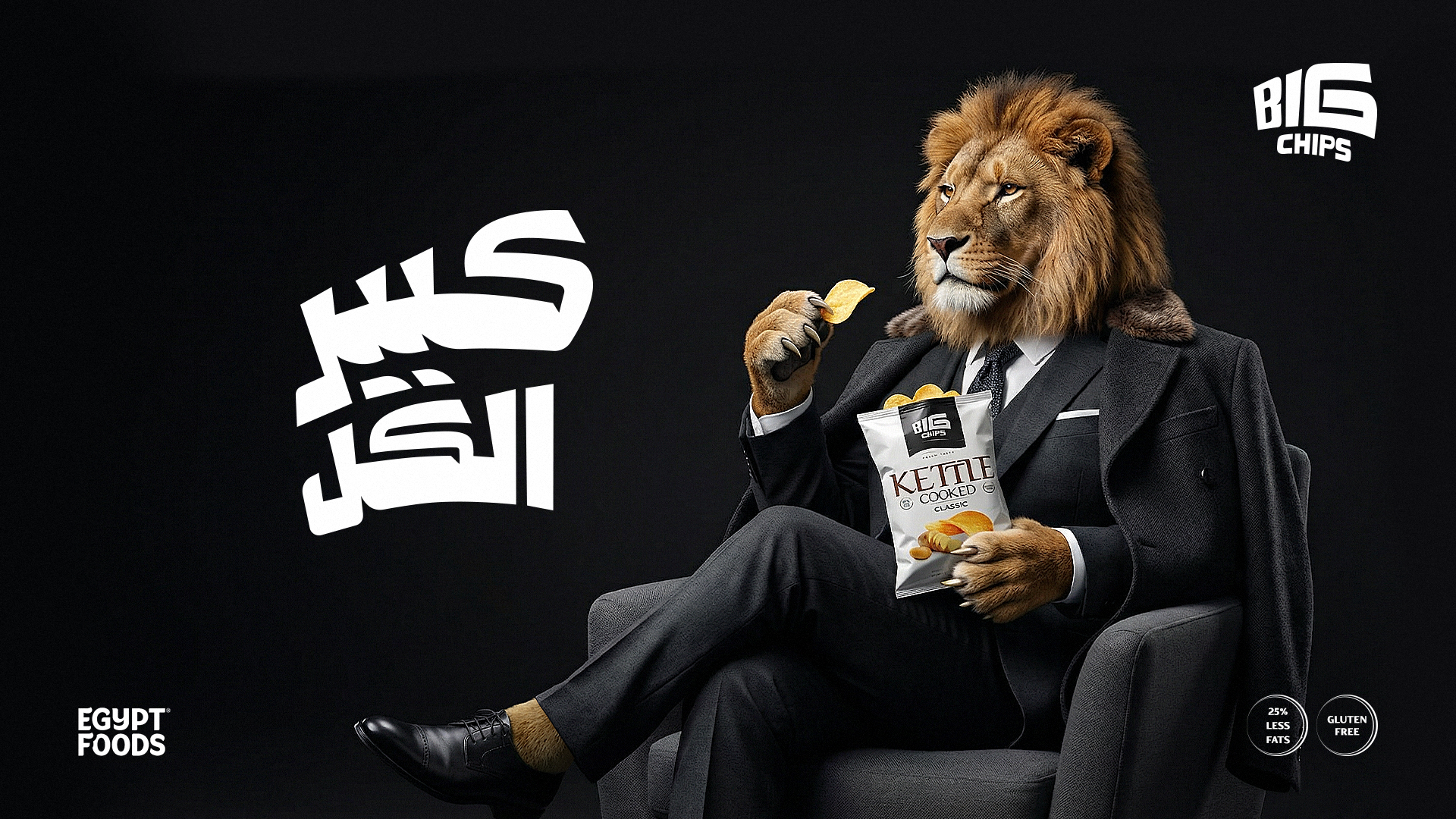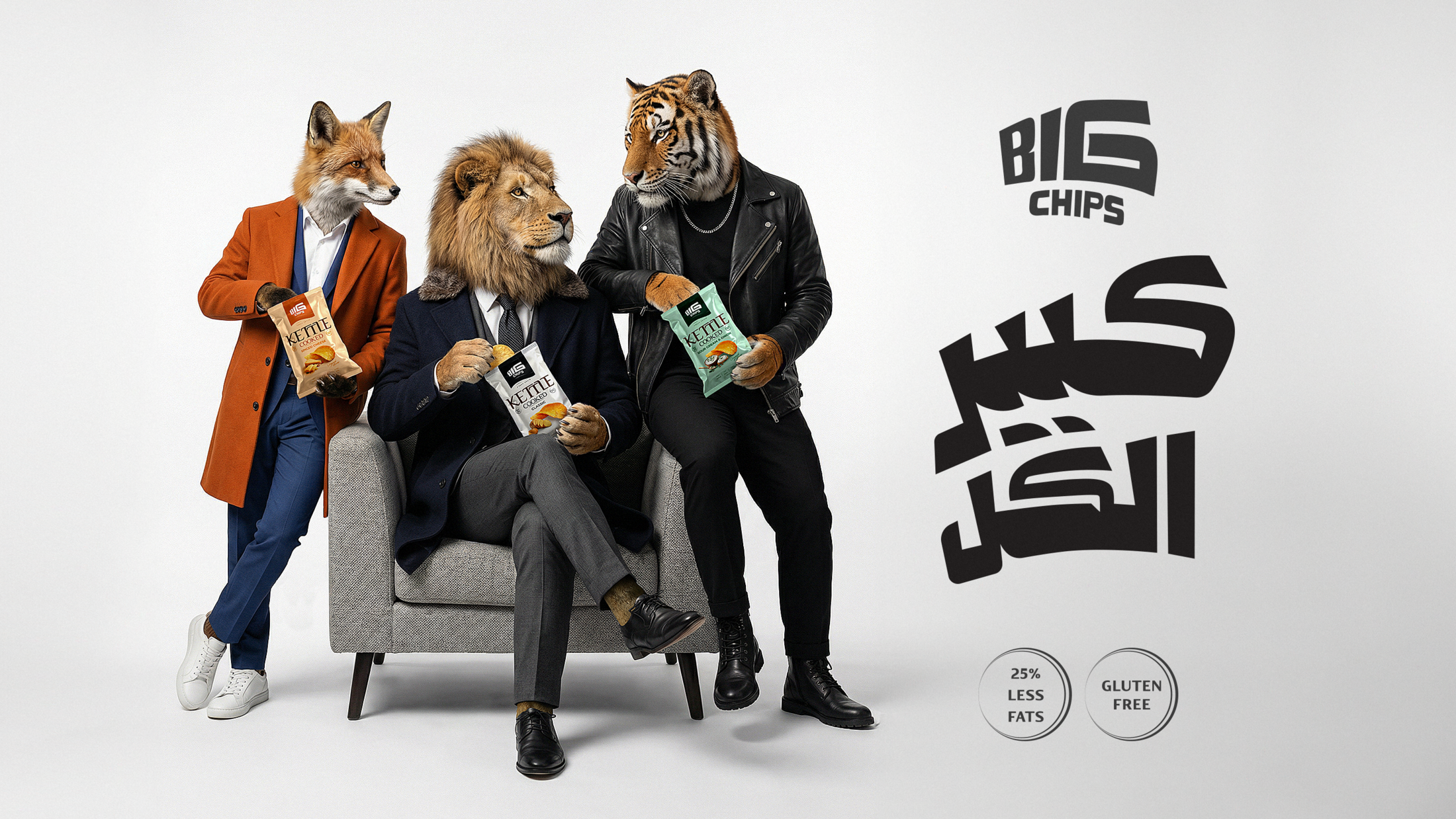 Instead of competing with similar symbols, Big Chips presents itself as the bigger name — to the point where those very animals are shown consuming the new product.