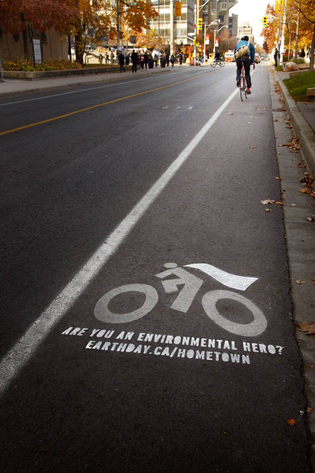 Media placement was the key to the success of these ads. We wanted to engage our target by creating out-of-the-ordinary changes to places where environmentalists are often found. We ultimately decided that bike lanes would be the ideal spot, and so we made the bicycle symbols in bike lanes into mini guerilla advertisements. By using washable, eco-friendly paint to draw a cape onto the bike lane people and attaching a call to action, environmentalists were engaged in an unexpected way.