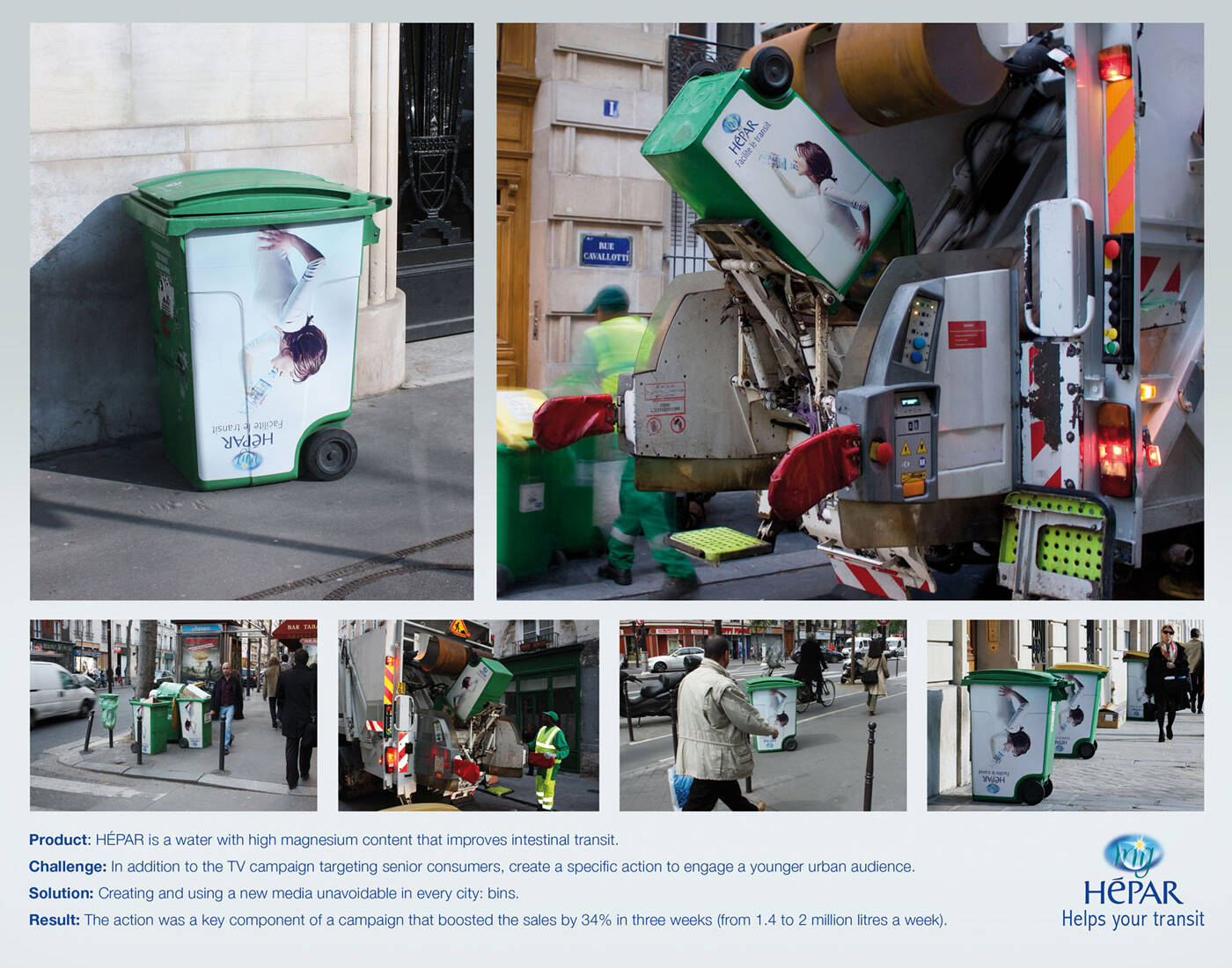This professional campaign titled 'Bins' was published in France in December, 2009. It was created for the brand: Hepar, by ad agency: Marcel. This Ambient medium campaign is related to the Drinks (Non Alcoholic) industry and contains 1 media asset. It was submitted almost 16 years ago.