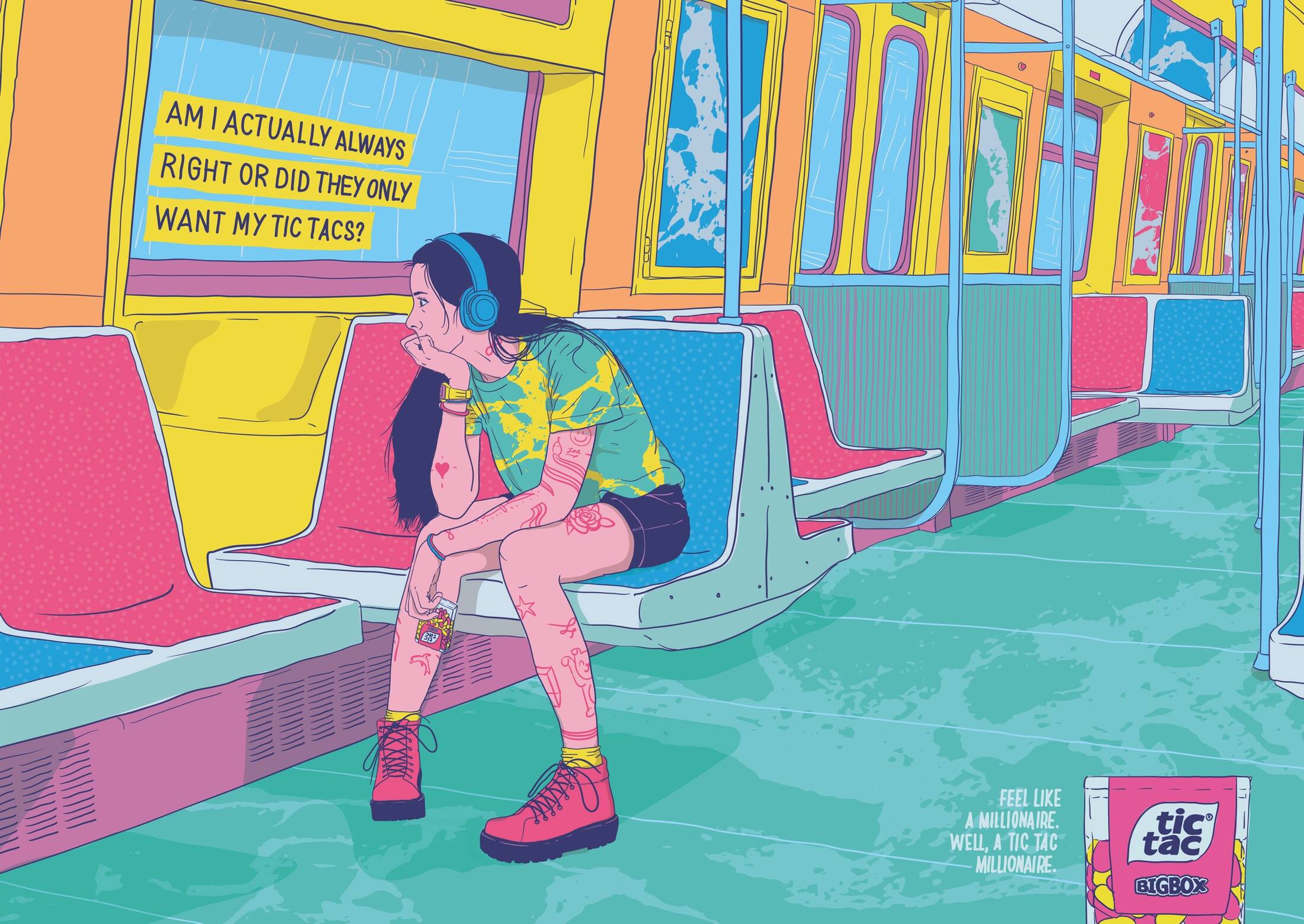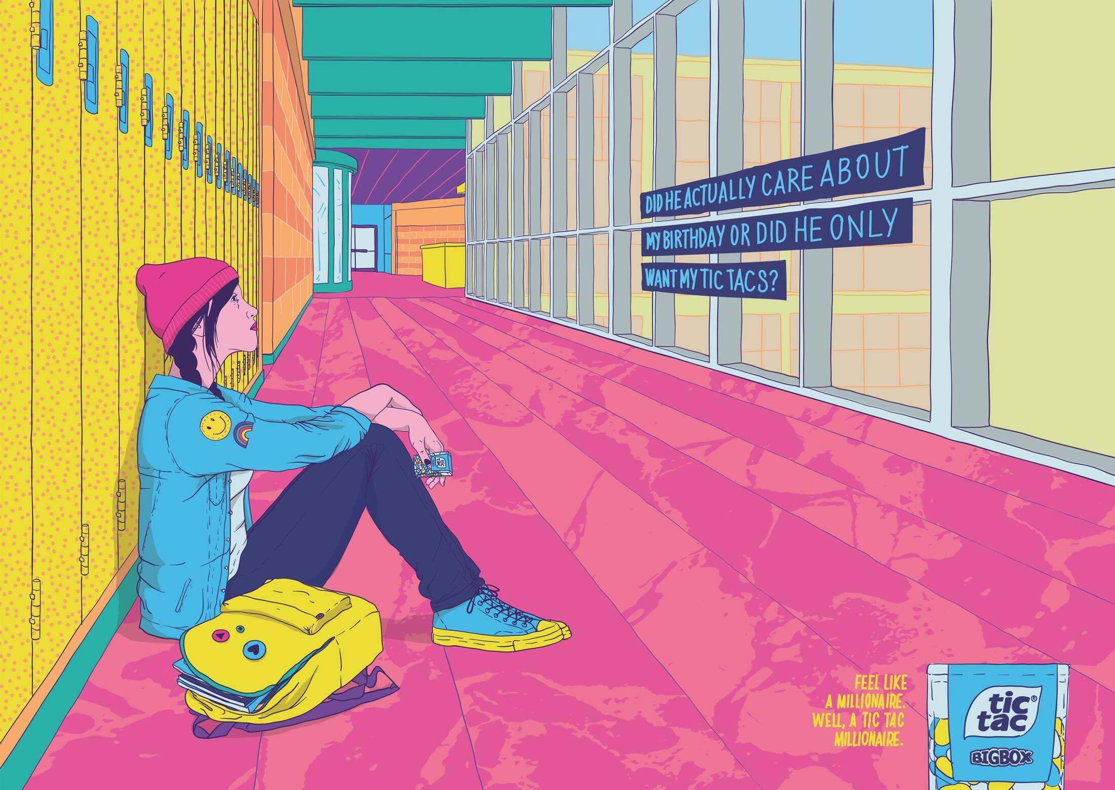 Running in Argentina, this colorful, tongue-in-cheek campaign chronicles three scenes, each of which features a person questioning their peers’ motives. In the “Birthday” spot, a girl sits in front of her locker, questioning whether her classmate truly cares about her birthday or just wanted a Tic Tac. Similarly, the other two print spots, “Funny” and “Be Right,” feature a man at the laundromat wondering whether his friends truly find him funny, and a woman slouched on the train as she ponders whether she’s actually always right. The questions appear written out in bold, pastel typeface, with each figure scrutinizing the words.