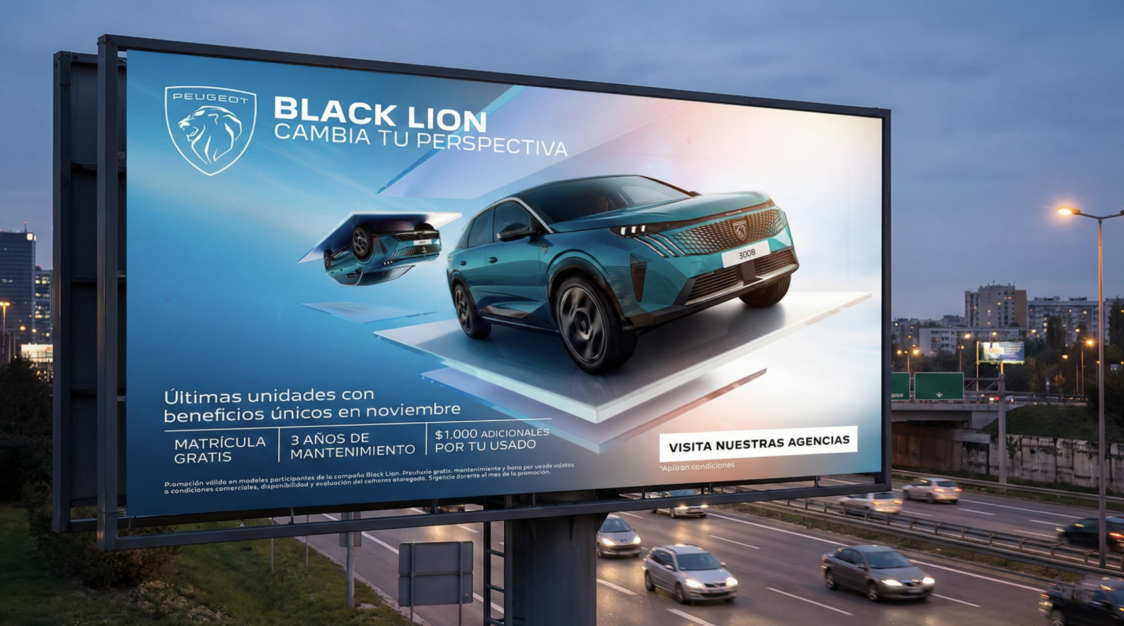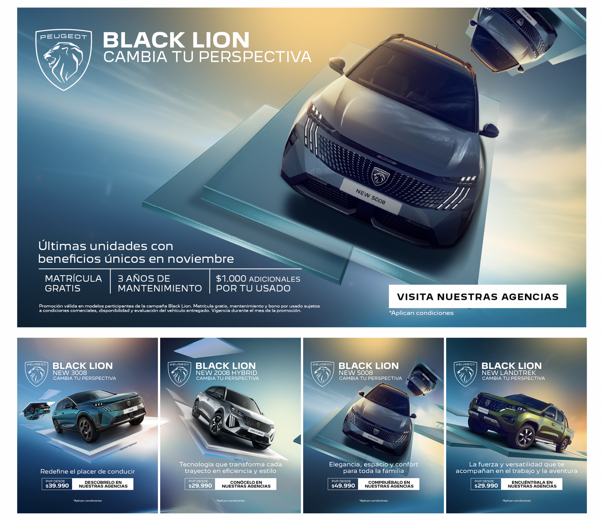 This professional campaign titled 'Black Lion "Cambia tu perspectiva"' was published in Ecuador in November, 2025. It was created for the brand: Peugeot, by ad agency: tbō Soluciones Integrales. This Content, Design, and Digital media campaign is related to the Automotive and Personal Transportation industry and contains 6 media assets. It was submitted about 17 hours ago by tbō Soluciones Integrales of tbō Soliciones Integrales.