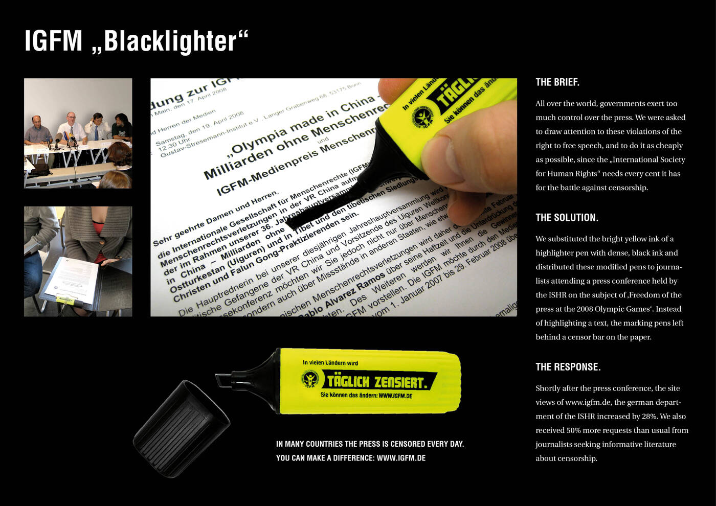 This professional campaign titled 'Blacklighter' was published in Germany in April, 2008. It was created for the brand: International Society for Human Rights, by ad agency: Jung von Matt. This Static Images medium campaign is related to the Public Interest industry and contains 1 media asset. It was submitted over 16 years ago.