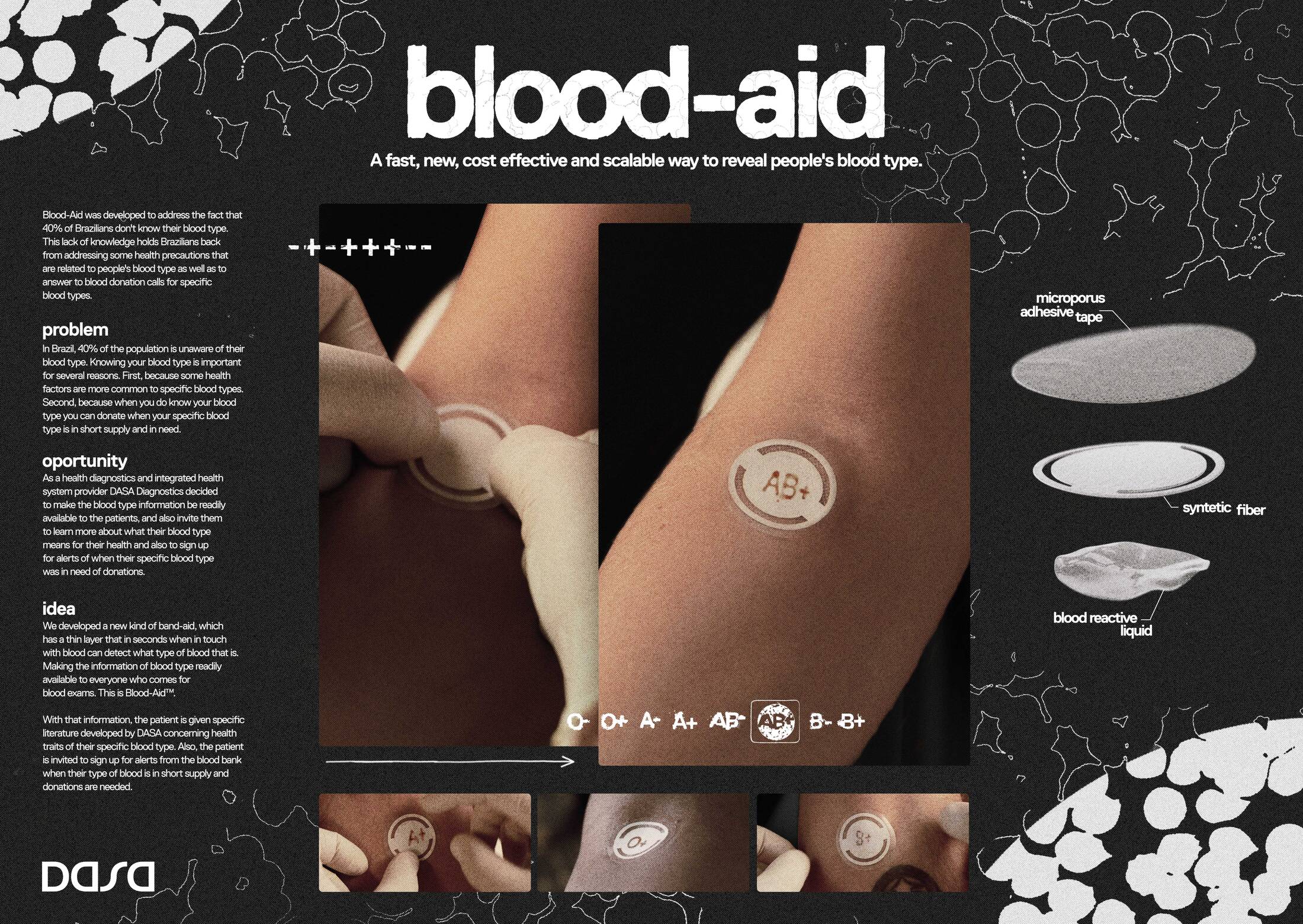 IDEA: We developed a new kind of band-aid, which has a thin layer that in seconds when in touch with blood can detect what type of blood that is. Making the information of blood type readily available to everyone who comes for blood exams. This is Blood-Aid™.