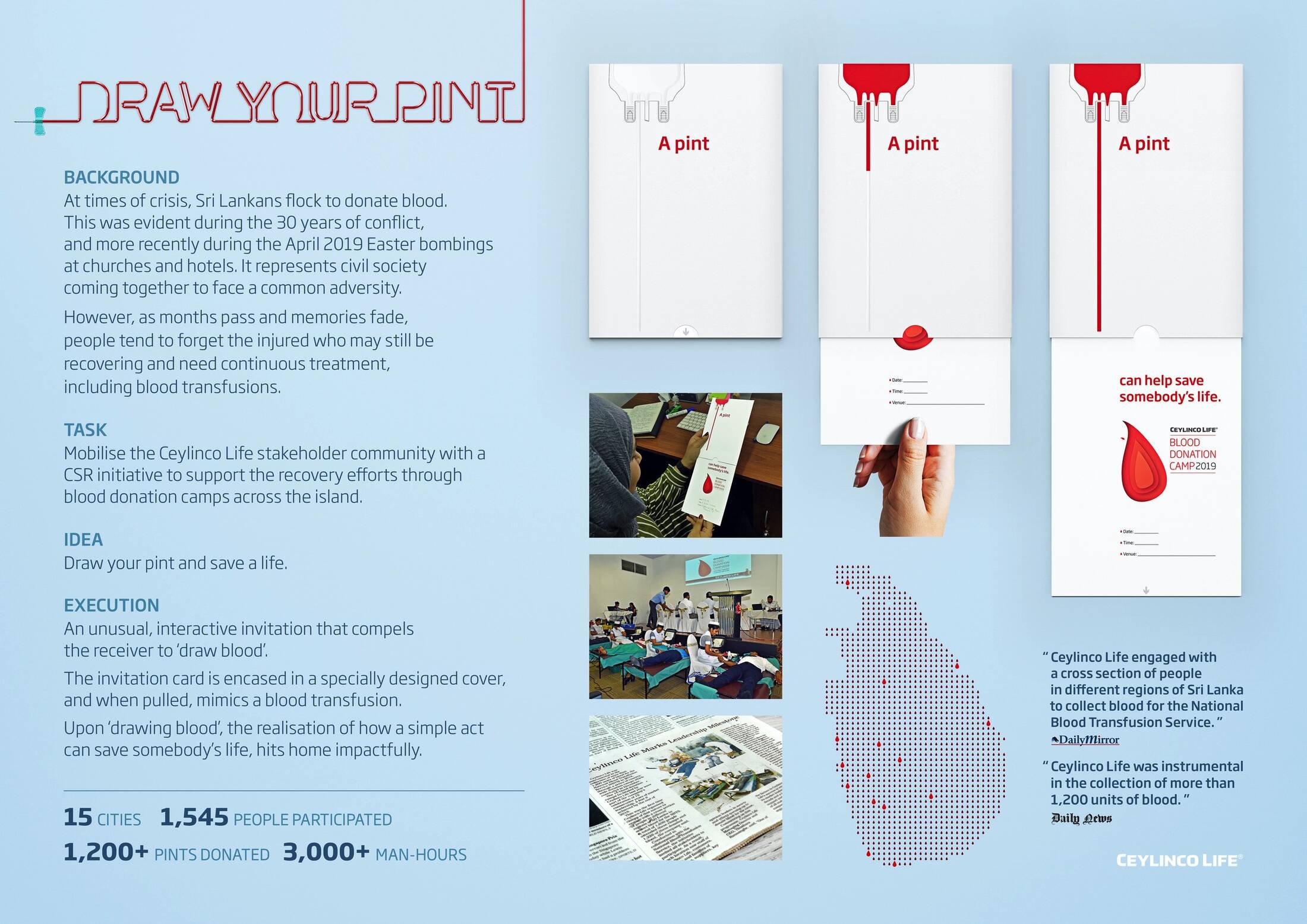 Background: At times of crisis, Sri Lankans flock to donate blood. This was evident during the 30 years of conflict, and more recently during the April 2019 Easter bombings at churches and hotels. It represents civil society coming together to face a common adversity. However, as months pass and memories fade, people tend to forget the injured who may still be recovering and need continuous treatment, including blood transfusions. Task: Mobilize Ceylinco Life’s stakeholder community with a CSR initiative to support the recovery efforts through blood donation camps across the island. Creative Idea: Draw your pint and save a life.