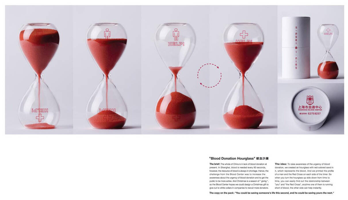 The idea: To raise awareness of the urgency of blood donation, we created an hourglass with red-colored sand in it, which represents the blood. And we printed the profile of a man and the Red Cross on each side of the timer. So when you turn the hourglass up side down from time to time, you can easily find out the relationship between "you" and "the Red Cross", anytime one of them is running short of blood, the other side can help instantly.