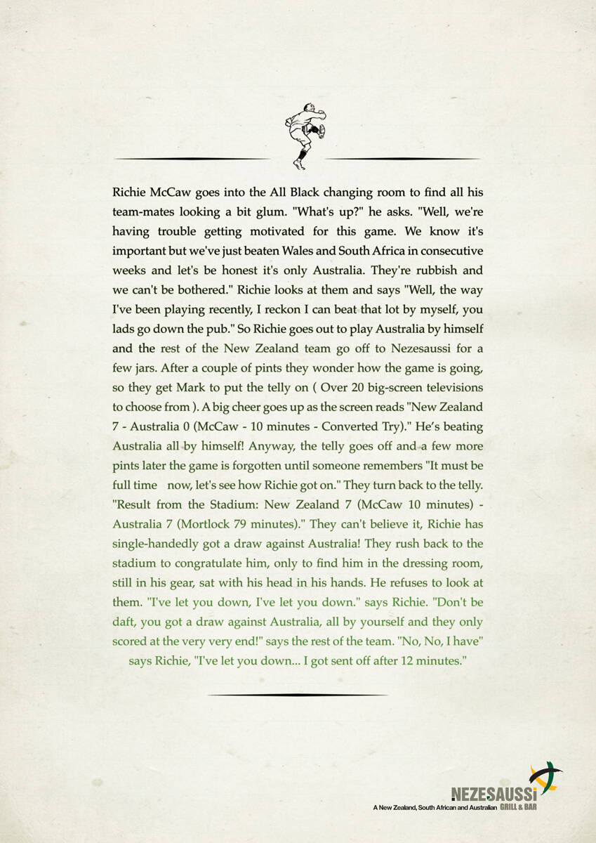This professional campaign titled 'Bookings, Live, Dishes, TV, Beer, Bar' was published on February 01, 2008. It was created for the brand: Nezesaussi Bar & Grill, by ad agency: Fortune Promoseven Dubai. This Print medium campaign is related to the Recreation, Leisure industry and contains 6 media assets. It was submitted almost 18 years ago.