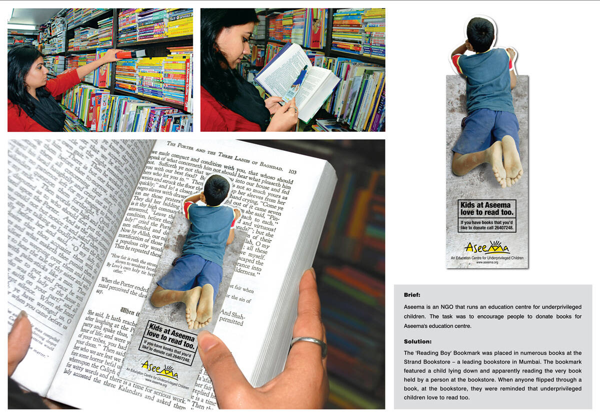This professional campaign titled 'Bookmark' was published in India in November, 2007. It was created for the brand: Aseema, by ad agency: TBWA. This Ambient medium campaign is related to the Public Interest industry and contains 1 media asset. It was submitted over 17 years ago.