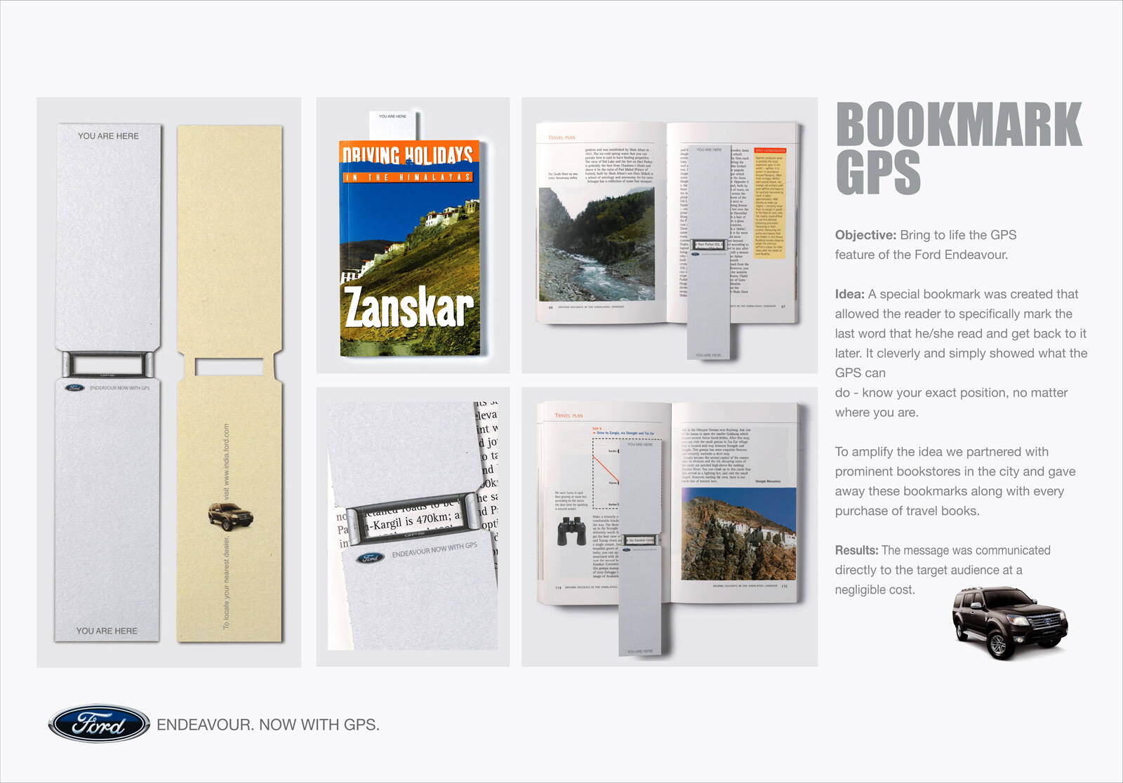 This professional campaign titled 'Bookmark GPS' was published in India in April, 2010. It was created for the brand: Ford, by ad agency: JWT. This Static Images medium campaign is related to the Automotive and Personal Transportation industry and contains 1 media asset. It was submitted over 14 years ago.