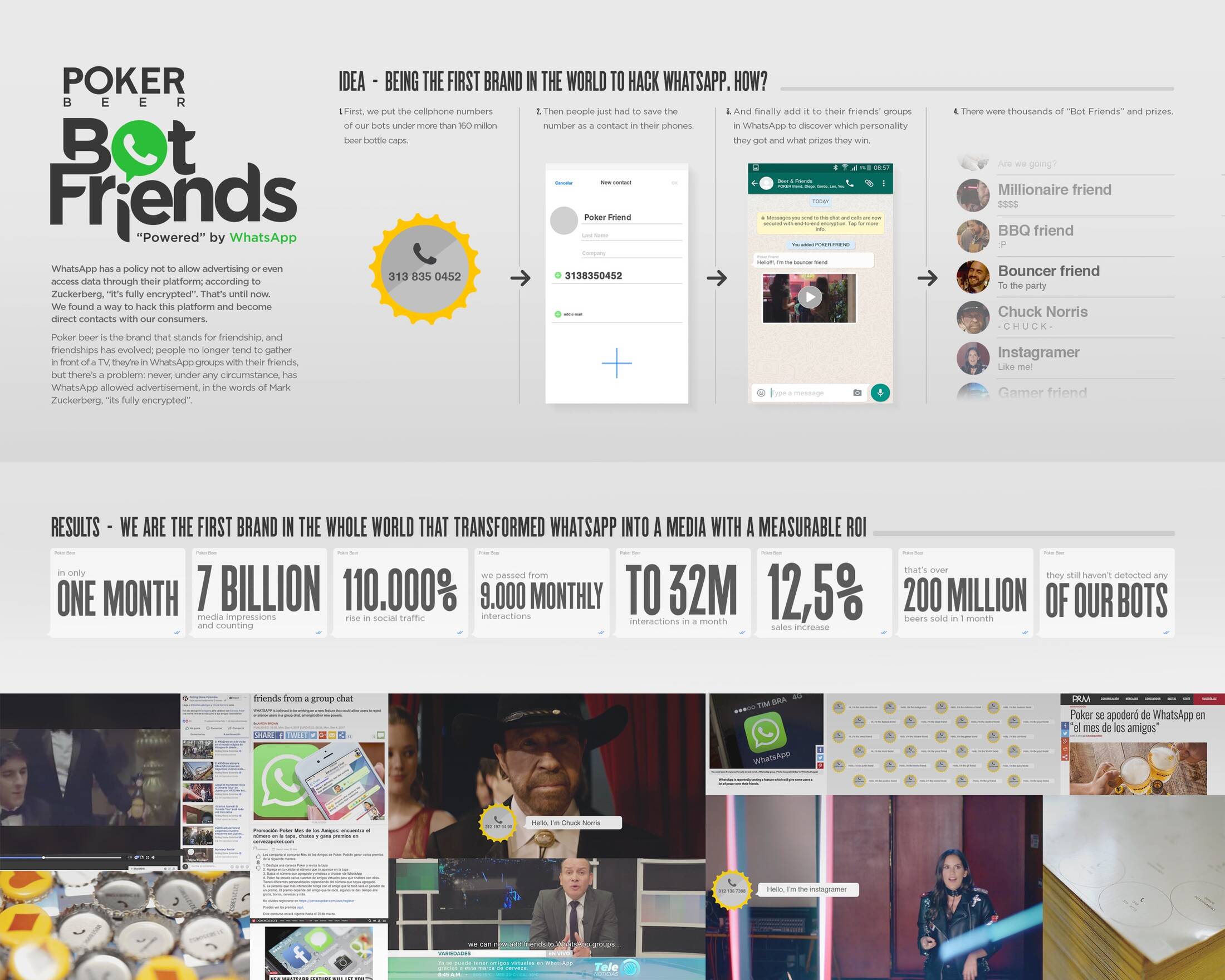 This professional campaign titled 'Bot Friends 'Powered' by Whatsapp' was published in Colombia in March, 2018. It was created for the brand: Poker Beer, by ad agency: DDB. This Digital medium campaign is related to the Alcoholic Drinks industry and contains 2 media assets. It was submitted about 7 years ago.