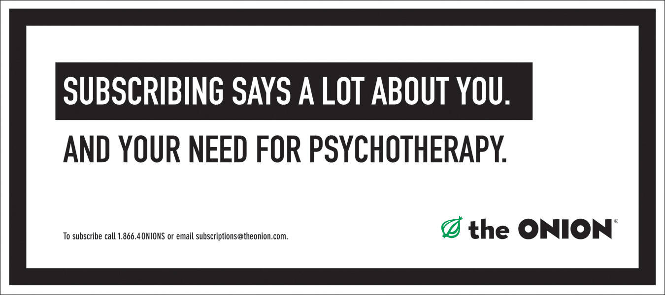 This professional campaign titled 'Both ends, Issues, Nothing, Psychotherapy, Unread, We lie...' was published in United States in April, 2012. It was created for the brand: The Onion, by ad agency: McKee Wallwork. This OOH Outdoor medium campaign is related to the Media industry and contains 8 media assets. It was submitted over 13 years ago.