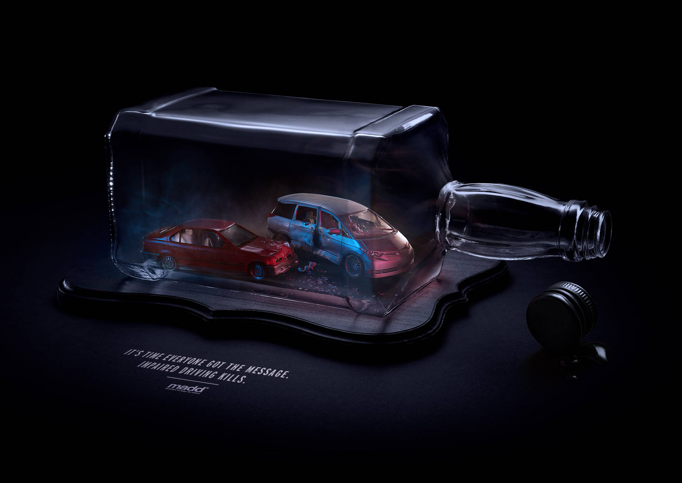 The PSAs are an art directional homage to a message in a bottle, wherein model crashes are set inside some of the world’s most iconic alcohol bottles. In this case, the ‘message’ is that grave consequences can result from consuming what’s inside the bottle and choosing to get behind the wheel.