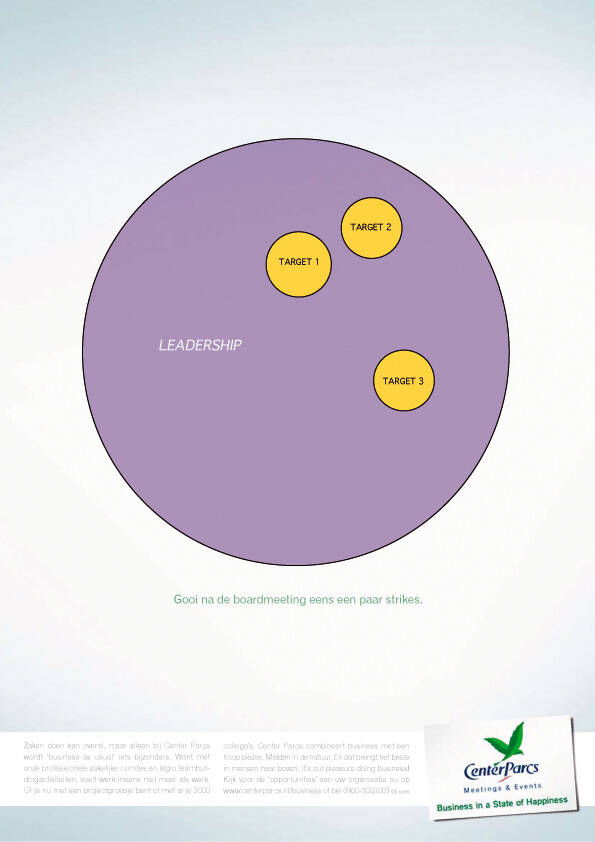 Center Parcs is well-known for their holiday parks in The Netherlands, Belgium, France and Germany. The parcs are all nicely settled in nature and you can do al kinds of holiday-activities like mountainbiking, bowling, golf, etc. What's less known is their business-accomadations (Center Parks Meetings & Events) for training, presentations, seminars, teambuilding-activities, etc. In this campaign business-models and powerpoint presentation graphics suggest to come and do business-stuff in Center Parcs. The campaign is also being launched online in all kinds of powerpoint-animations.