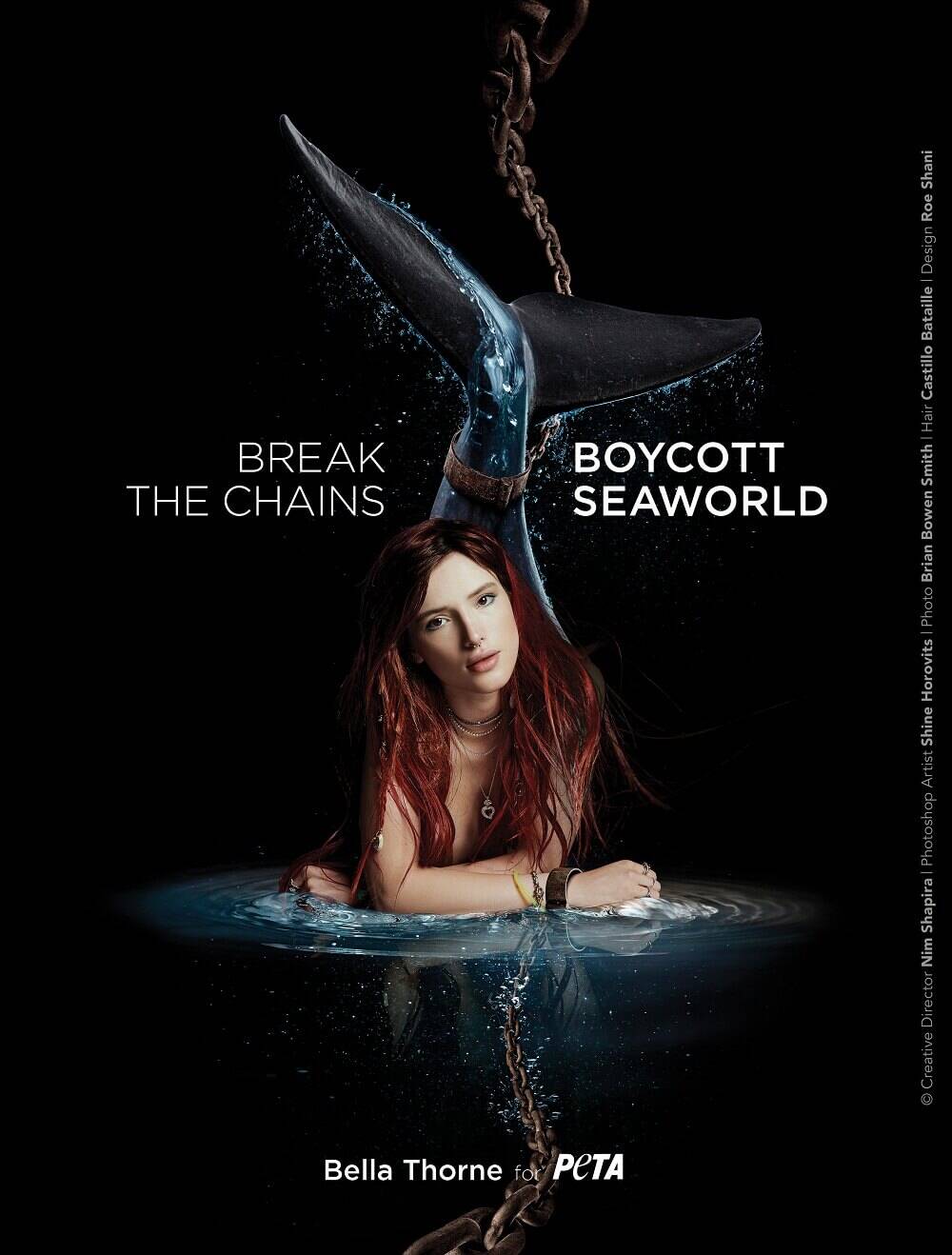 In this new eye-catching PETA campaign, Bella is depicted as a half-human, half-orca, her tail and wrists in chains. She is asking her fans to 'break the chains' holding the animals in captivity.