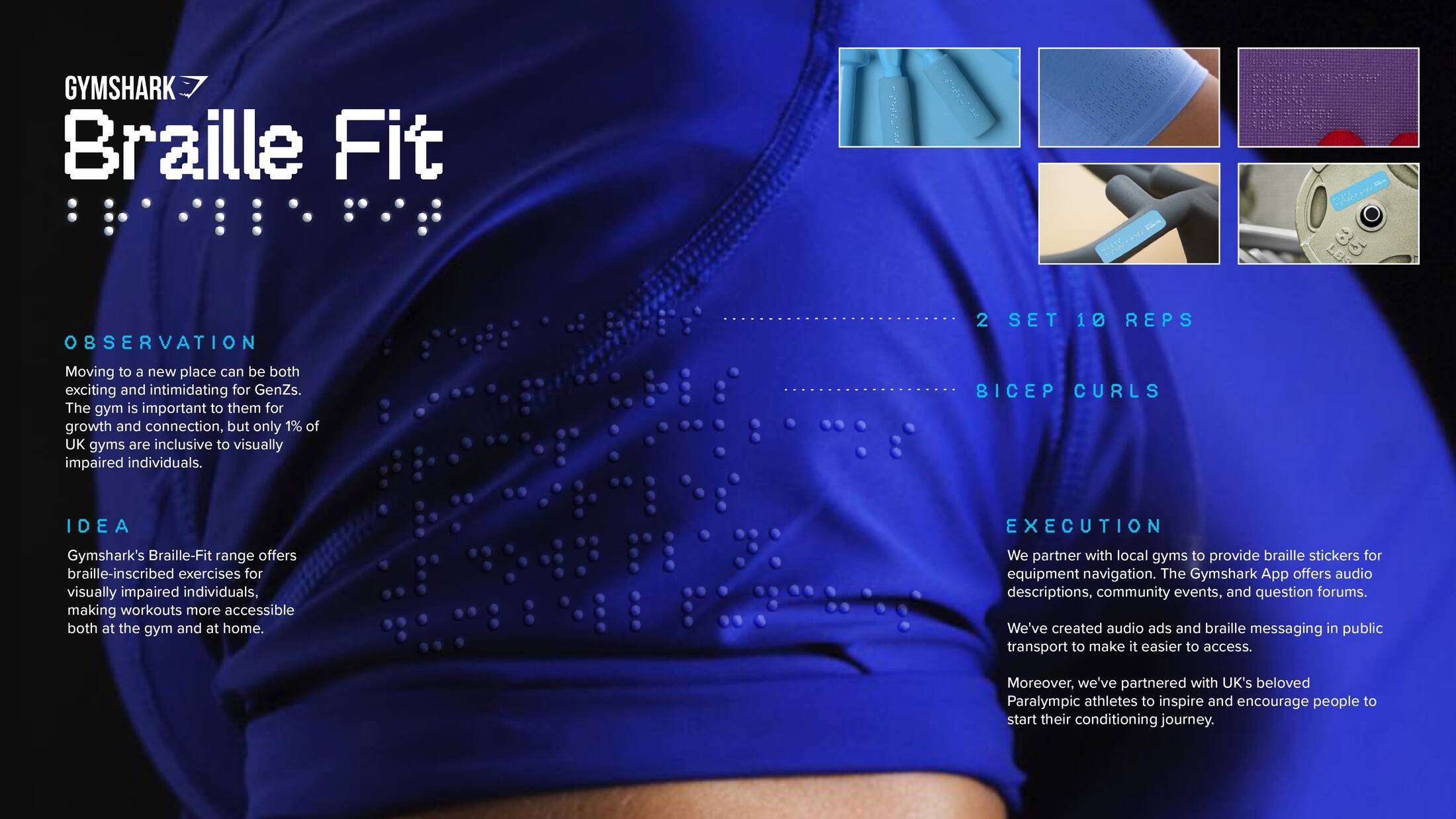 This student campaign titled 'Braille Fit' was published in Germany in March, 2023. It was created for the brand: Gymshark, by ad school: Miami Ad School Europe. This Digital, Integrated, and OOH Outdoor media campaign is related to the Sports and Sportswear industries and contains 5 media assets. It was submitted about 2 years ago by Mehdi A. Bouktache of Miami Ad School EU .
