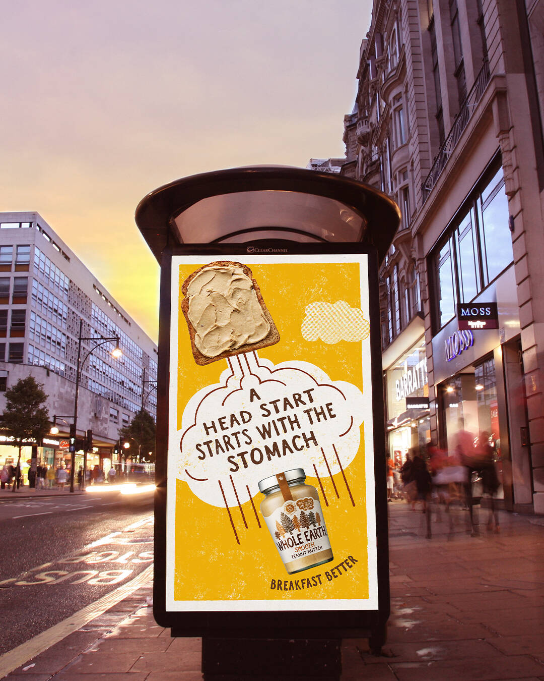 The OOH executions (three in total) feature delicious looking serves of whole earth playfully placed over striking illustrations and accompanied by witty headlines. One execution features a delicious looking peanut butter bagel rising in place of the sun with the headline “Rising is easy, shining is the tricky bit”, another execution sees the toast on top of an illustrated winners cup being held aloft, the text reads ‘Winners cut crusts, not corners’ and the final execution shows a rocket taking off with the headline “A head start starts with the stomach” all with the new line ‘Breakfast Better’.