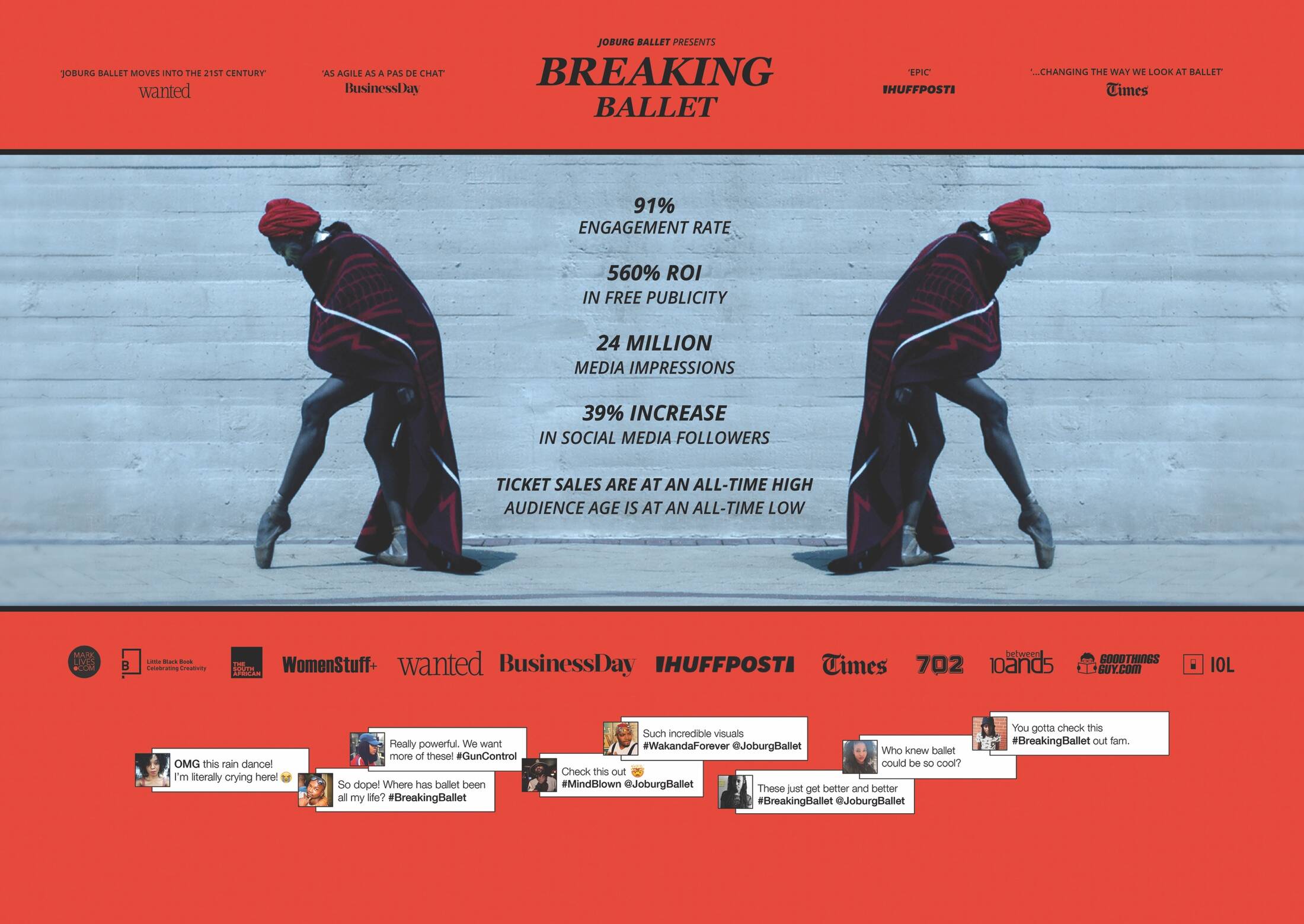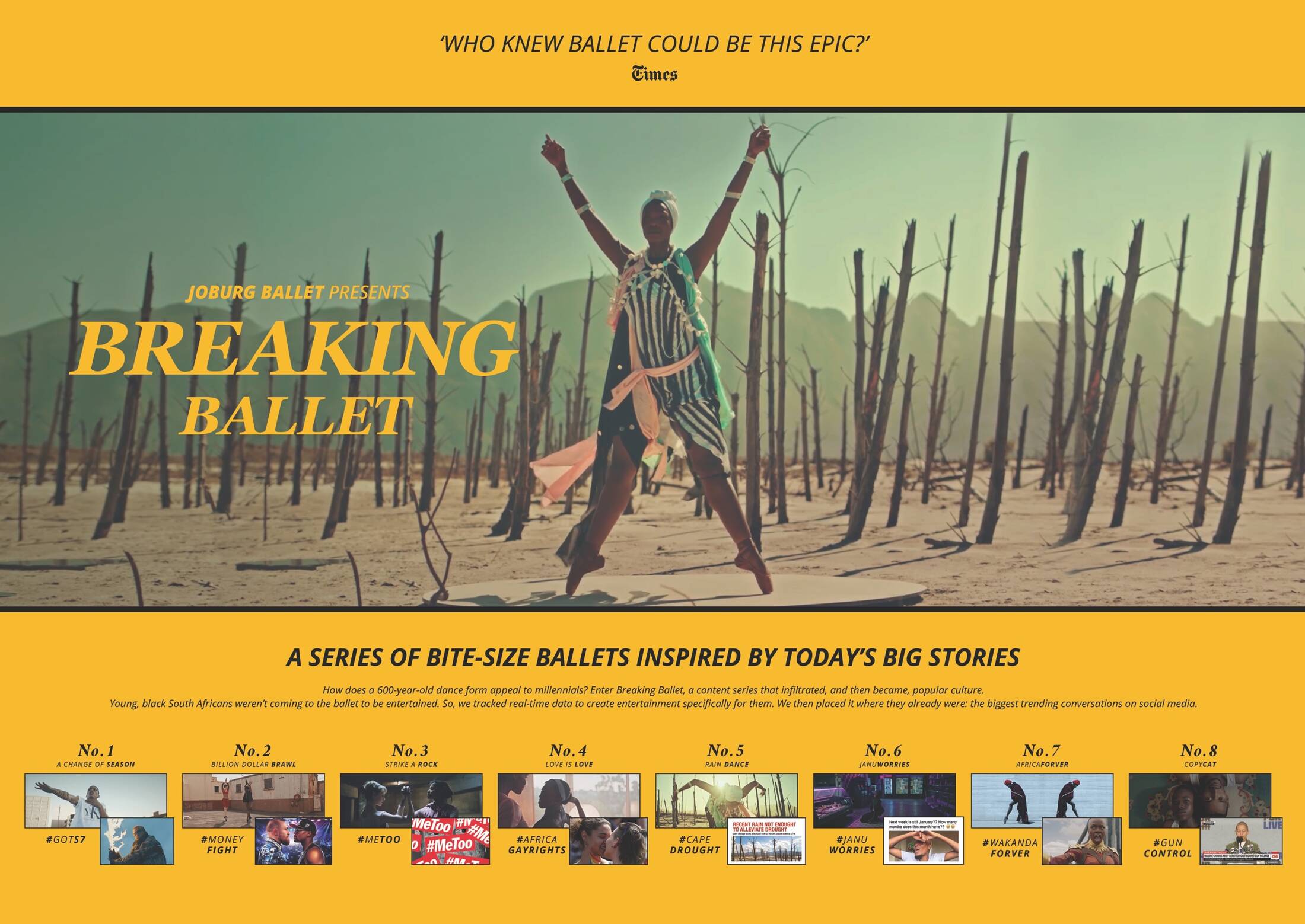 This professional campaign titled 'Breaking Ballet' was published in South Africa in July, 2017. It was created for the brand: Joburg Ballet, by ad agency: TBWA. This Integrated medium campaign is related to the Recreation, Leisure industry and contains 4 media assets. It was submitted about 7 years ago.