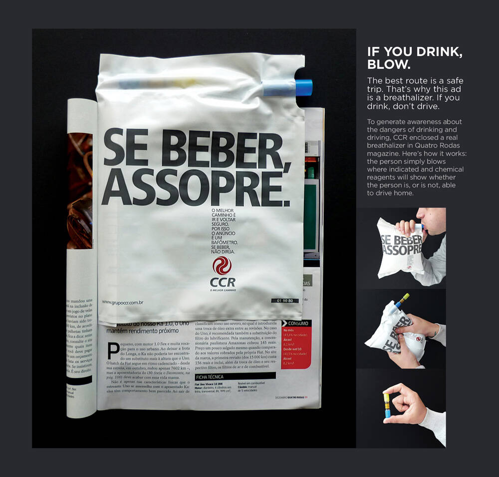 This professional campaign titled 'Breathalizer' was published in Brazil in December, 2010. It was created for the brand: CCR, by ad agency: Ludocca. This Static Images medium campaign is related to the Public Interest industry and contains 1 media asset. It was submitted almost 15 years ago.