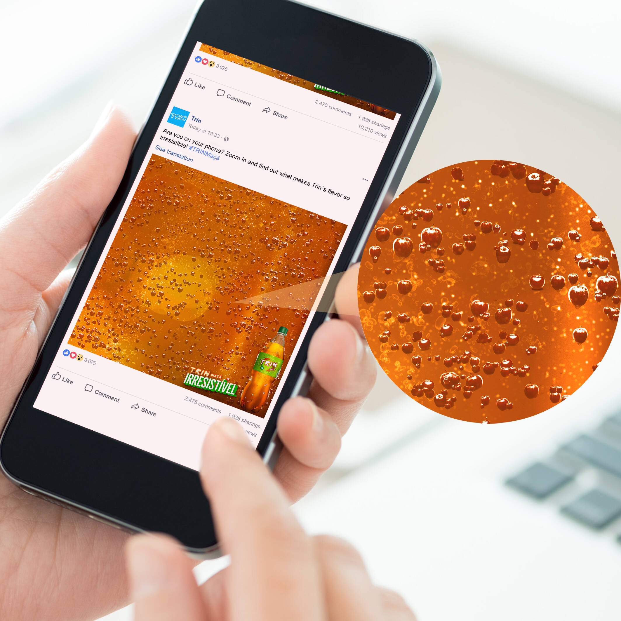 To reenforce the essence of the flavour of the Trin Apple soda, we designed a mobile action that we invited users to zoom on the image. Then, we revealed that the bubbles was, in fact, made by real apples.