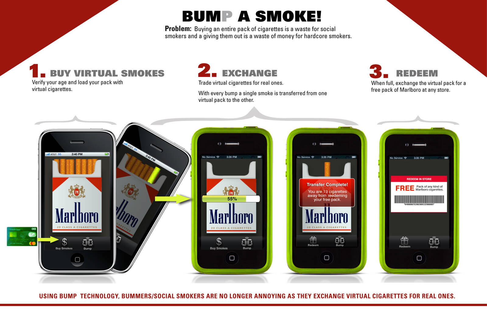 Using bump technology, bummers/social smokers are no longer annoying as they exchange virtual cigarettes for real ones.