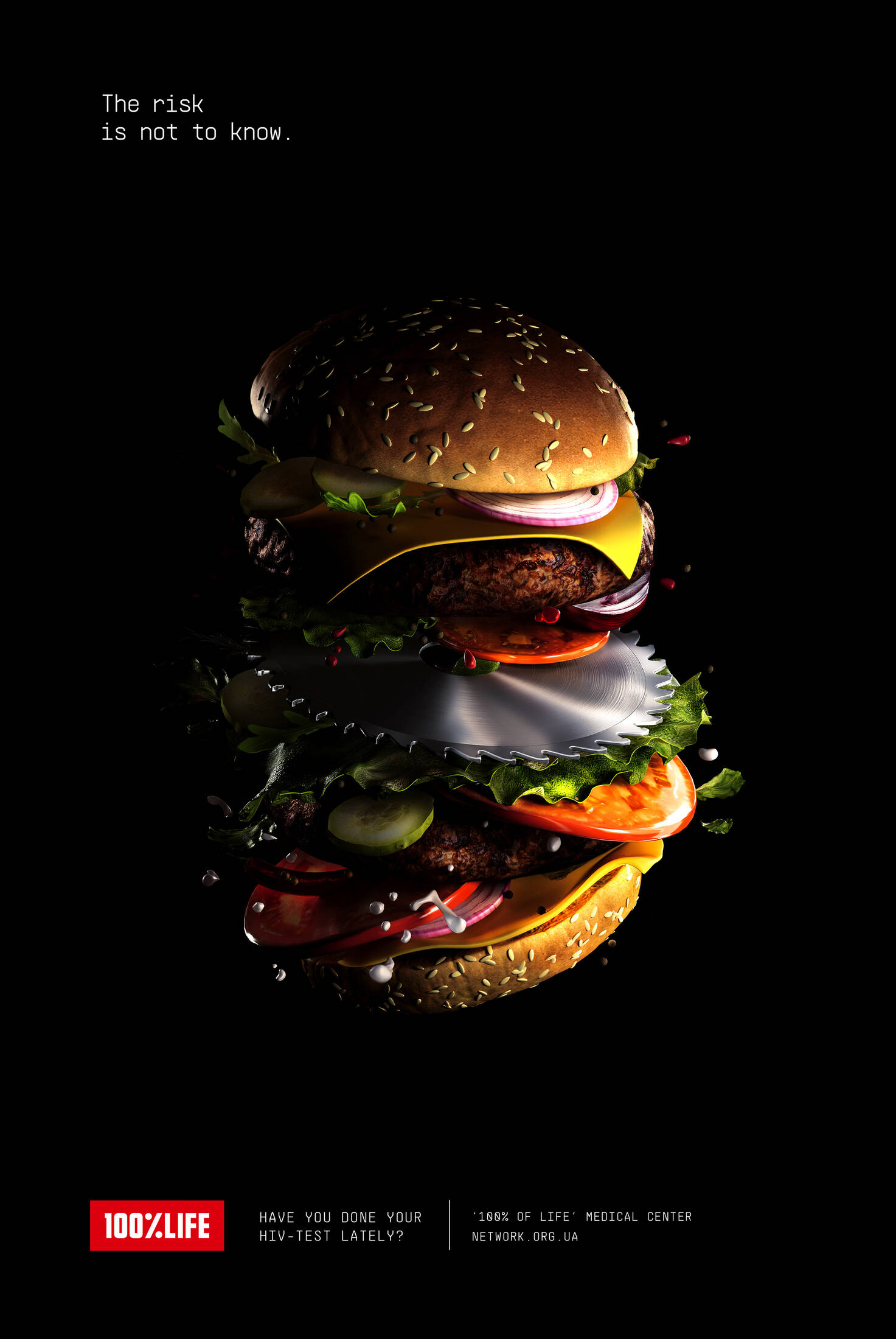 HIV if dangerous if you don't know about it. The earlier the test is performed, the more chances to save one's life. We used metaphor to show that HIV is hidden in our everyday routine by showing burger with the circle saw blade — one has to be careful to detect it before harm is made.