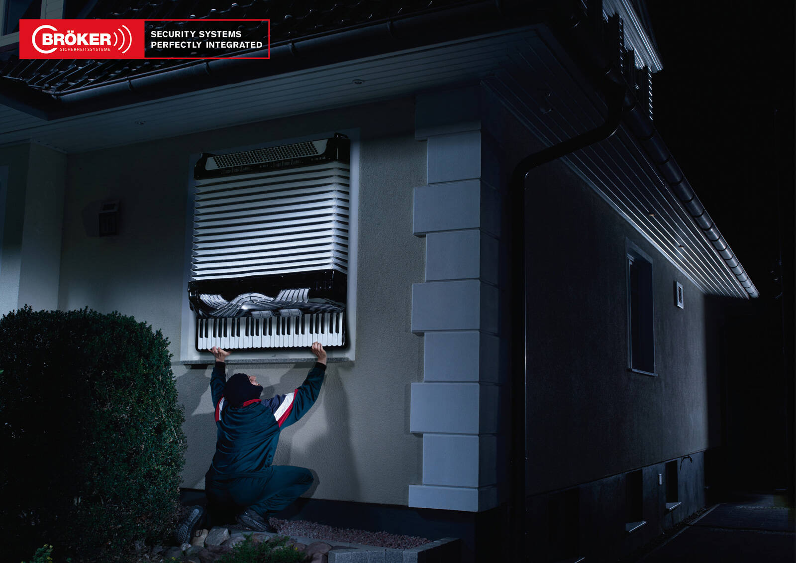 This professional campaign titled 'Burglars, Accordion, Burglars, Horn, Burglars, Piano' was published in Germany in September, 2011. It was created for the brand: Bröker Security Systems, by ad agency: Publicis. This Print medium campaign is related to the Professional Services industry and contains 3 media assets. It was submitted about 14 years ago.