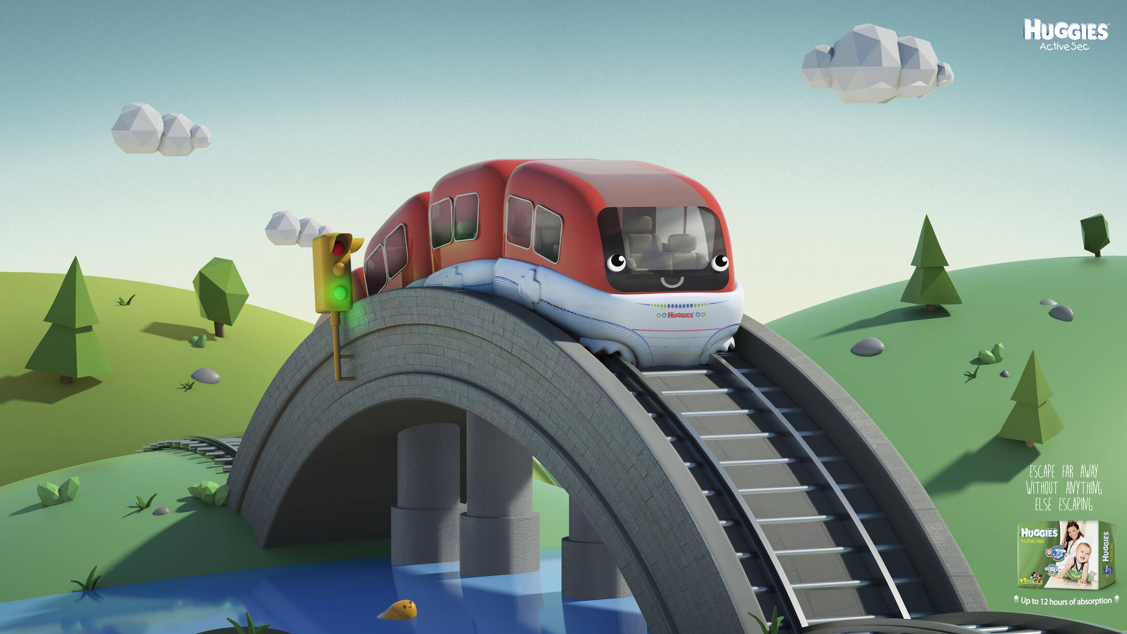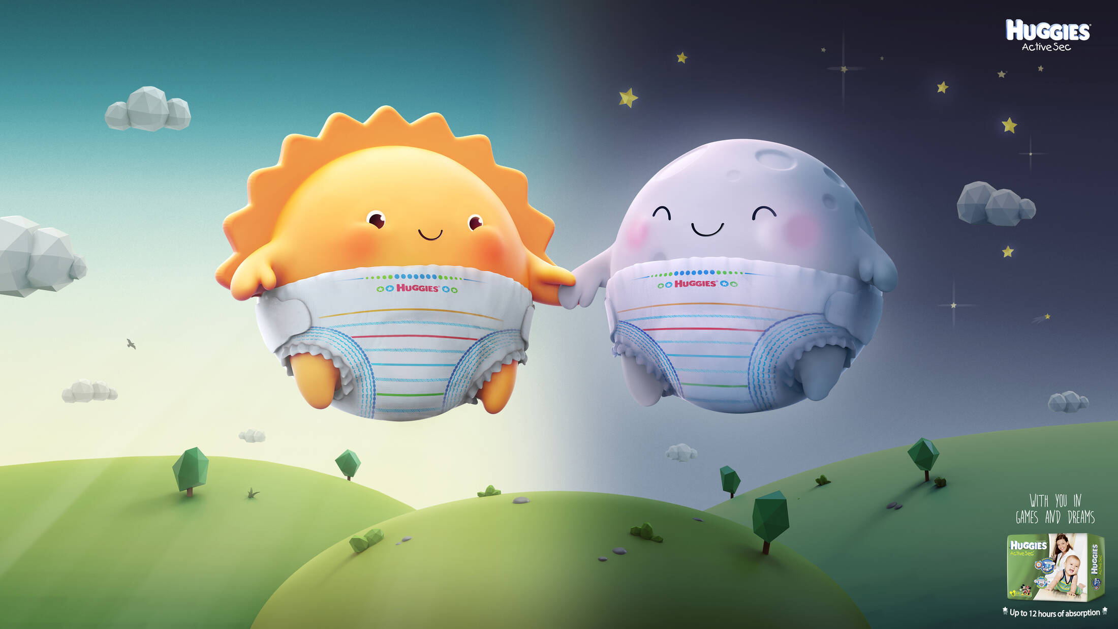 Huggies Active Sec is the diaper that holds up to 12 hours with maximum absorption. Ideal for children to wear in special occasions such as long days or nights, small or long family trips. The purpose of the graphic design was to represent the long journeys that this diaper can hold giving you total trust that nothing will escape from it.