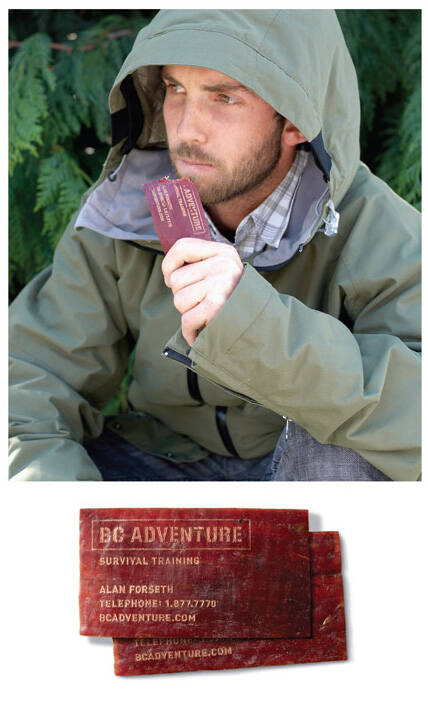 The first rule of wilderness survival is preparation. That's why BC Adventure wanted to make sure everyone who stepped through their door left at least a little more prepared for the wild. Made from organic beef jerky this laser etched card is good to eat for up to a year in case you find yourself stuck in a precarious situation.