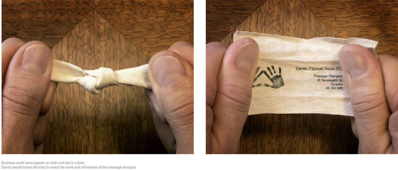 Business cards were typeset on cloth and tied in a knot. Clients would loosen the knot to reveal the name and information of the massage therapist.