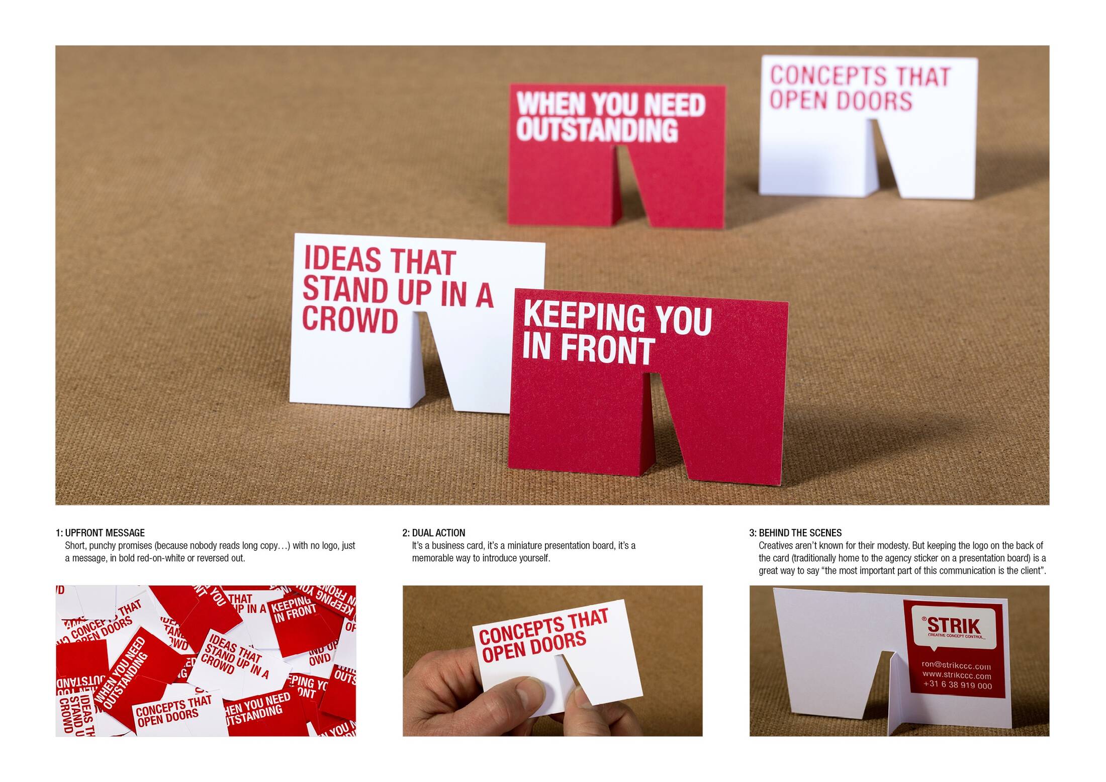 StrikCCC Business cards. The stand on a presentation board is a familiar sight to creatives and clients alike. We all recognise the do-or-die moment when that triangular white cardboard cracks free from its rest… and the board with your work stands face-to-face with the client for the first time. That’s the inspiration. A little window into the world of communication. A business card that says what it does, twice in two different ways.