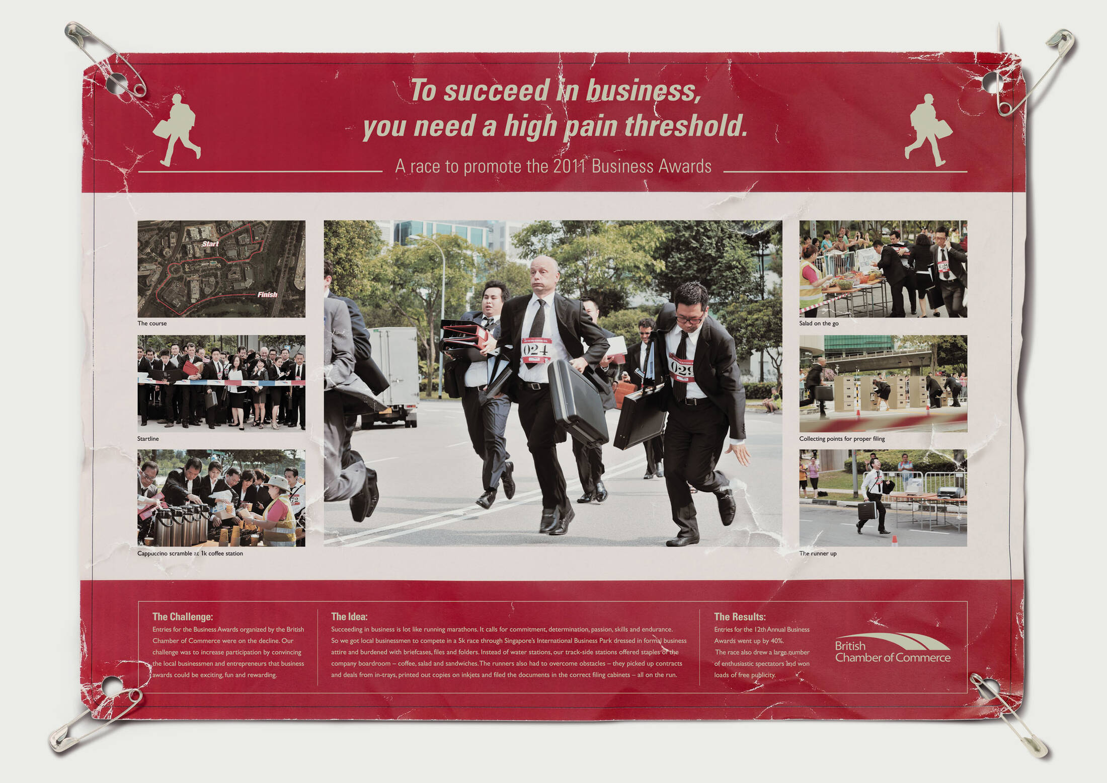 This professional campaign titled 'Business Run' was published in Singapore in May, 2016. It was created for the brand: British Chamber of Commerce, by ad agency: Ogilvy. This Ambient medium campaign is related to the Professional Services industry and contains 1 media asset. It was submitted about 13 years ago.