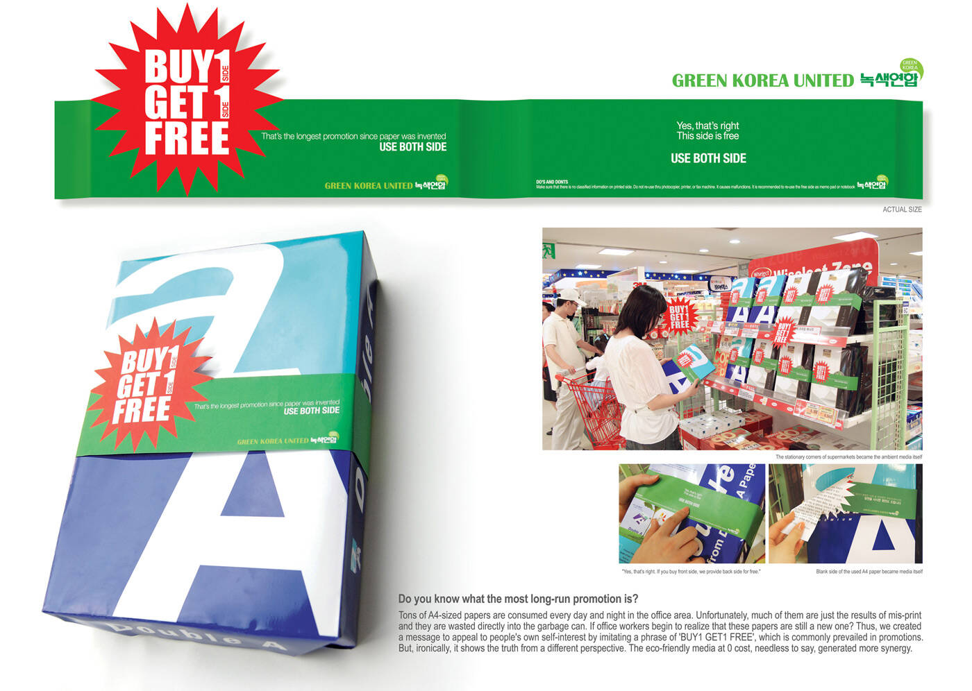 This professional campaign titled 'Buy 1 get 1 free' was published in South Korea in March, 2009. It was created for the brand: Green Korea United, by ad agency: Daehong. This Static Images medium campaign is related to the Public Interest industry and contains 1 media asset. It was submitted over 16 years ago.