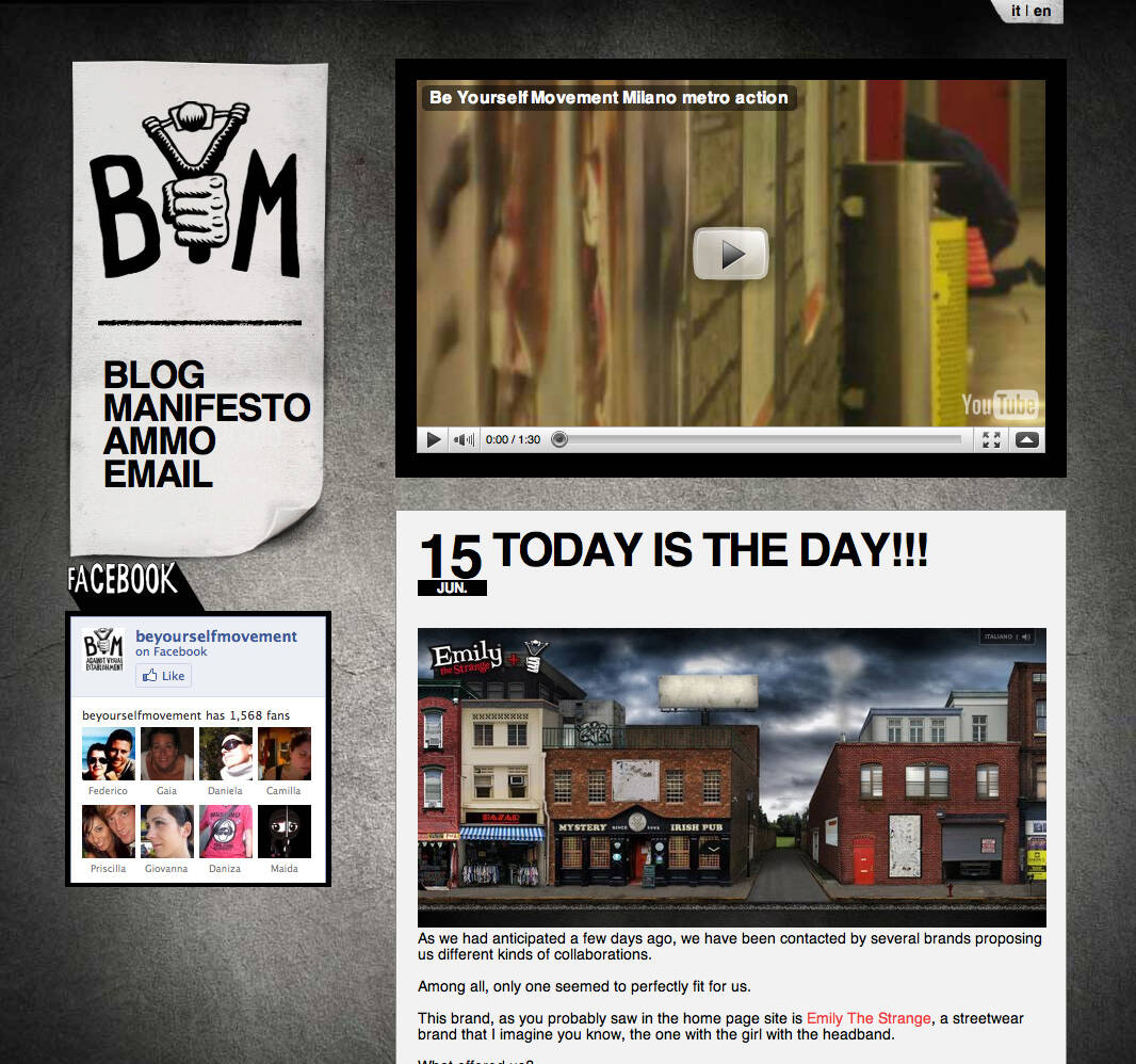 Lifestyle brand Emily the Strange has pitched itself headlong into the Be Yourself Movement, an italian artistic movement against visual establishment. Encouraging its fans and all people to be themselves and be free about expression, the Be Yourself Website features a cityscape dotted with blank billboards and advert spaces that visitors can graffiti however they like, using the tools provided: by saving them, banners user generated, go online in the planned website network!
