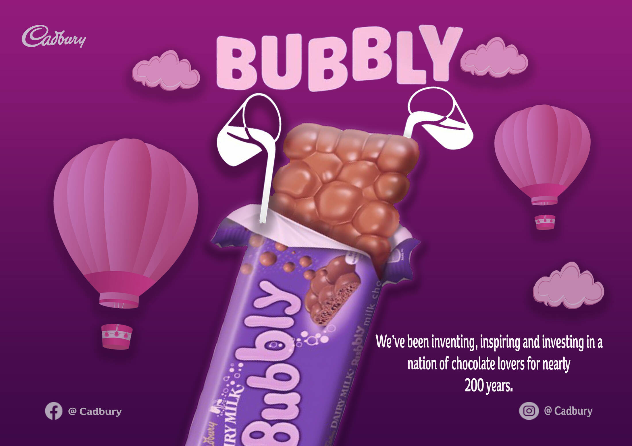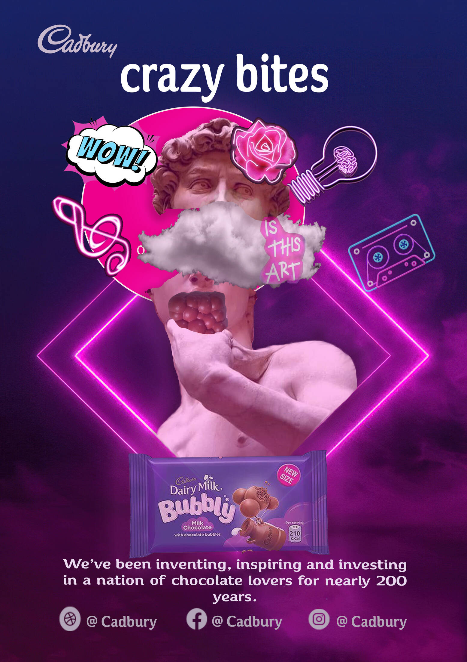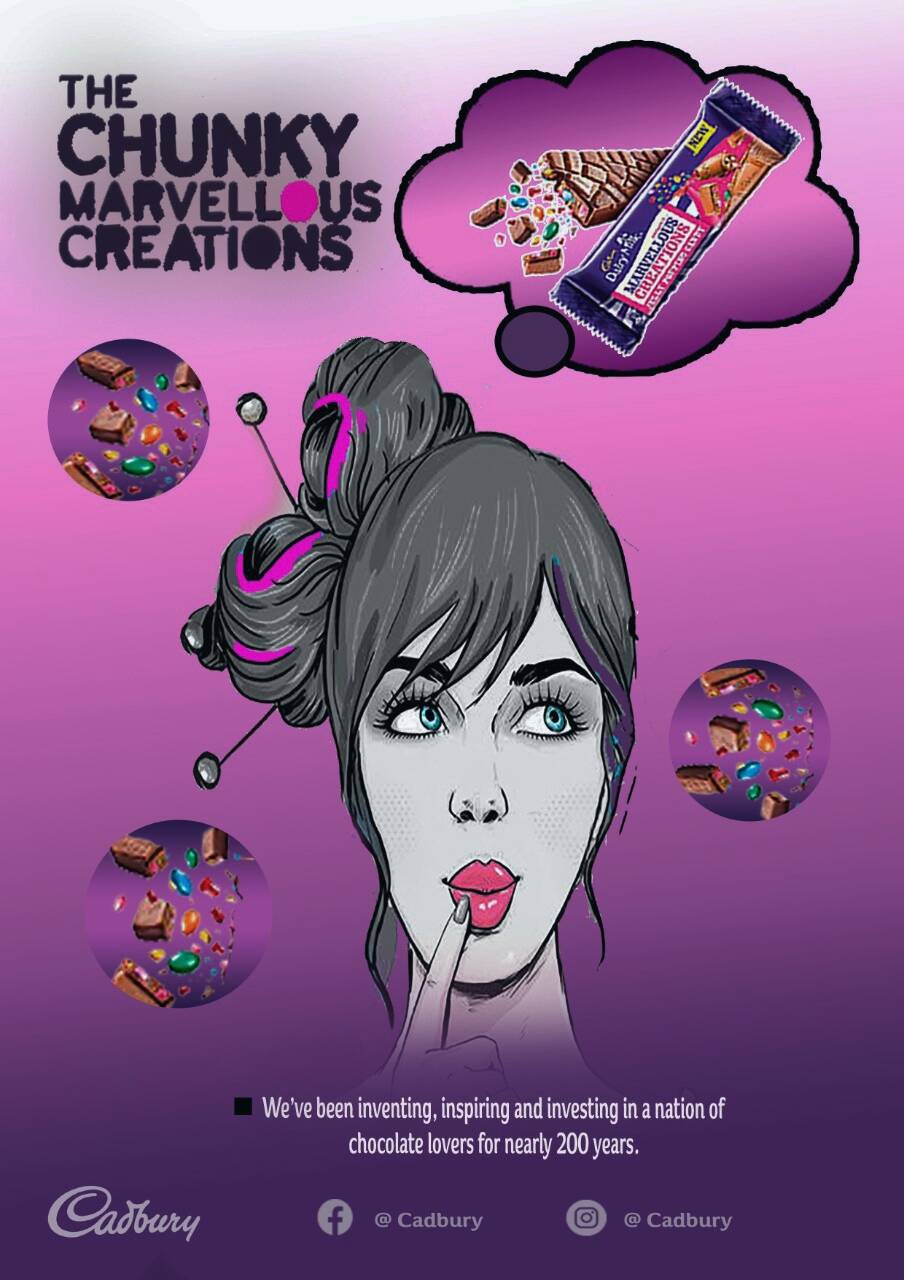 Chocolate is one of the most important reasons for happiness, and Cadbury is considered one of the companies that employed happiness in various and different forms in its products such as Bubbly, Marvel’s Creation, etc. For this reason, it unleashed the fullest creativity and conveyed the feeling of all its chocolate in a different and innovative way. Different schools of art, such as pop art, in order to suit teenagers and the modern era, and other methods, such as black and white, and used the appropriate words that fit with the goals of Cadbury, such as that every bite has fun and that chocolate can fix your day