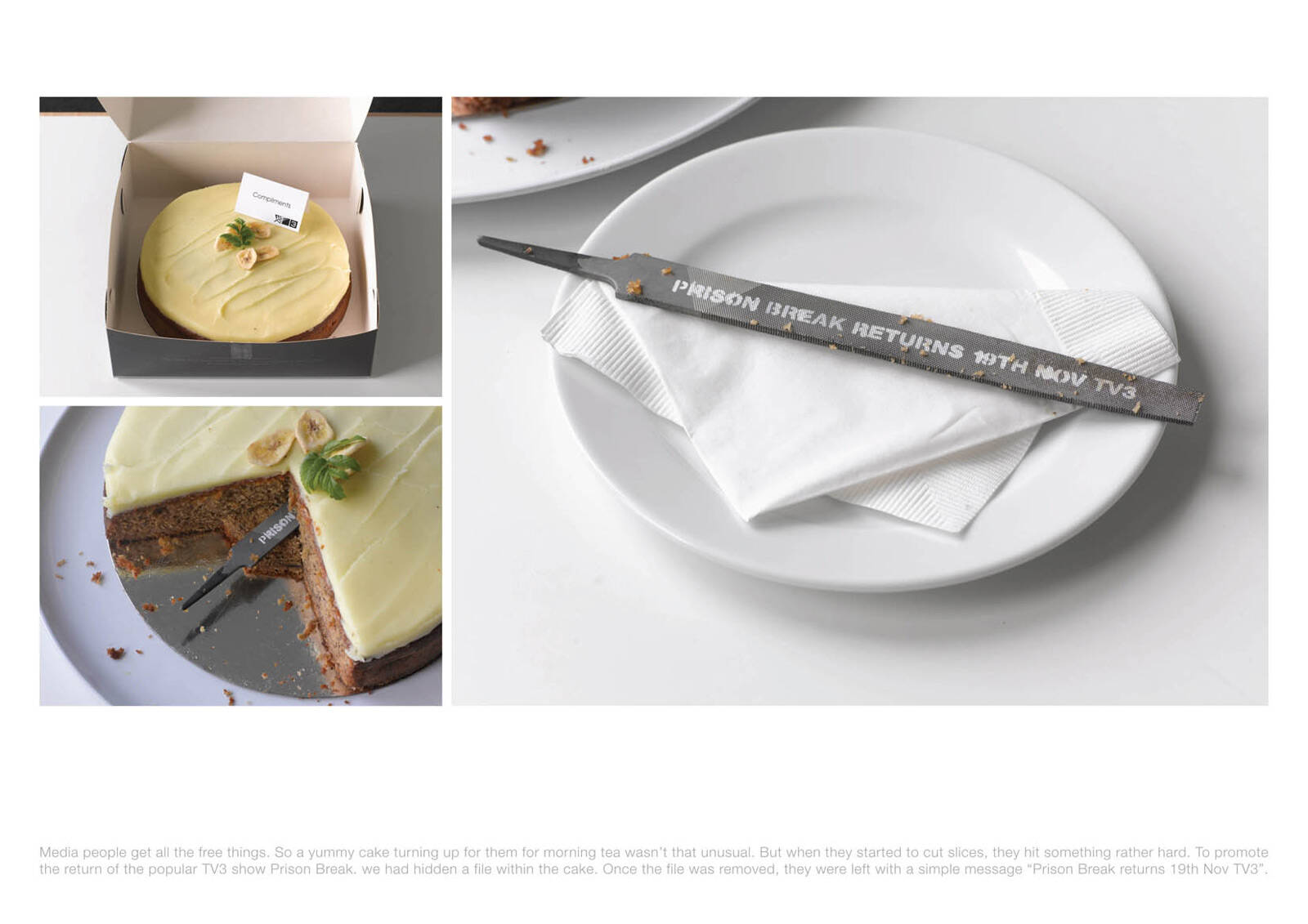 Media people get all the free things. So a yummy cake turning up for them for morning tea wasn't that unusual. But when they started to cut slices, they hit something rather hard. To promote the return of the popular TV3 show Prison Break, we have hidden a file within the cake.Once the file was removed, they were left with a simple message "Prison Break returns 19th Nov TV3".