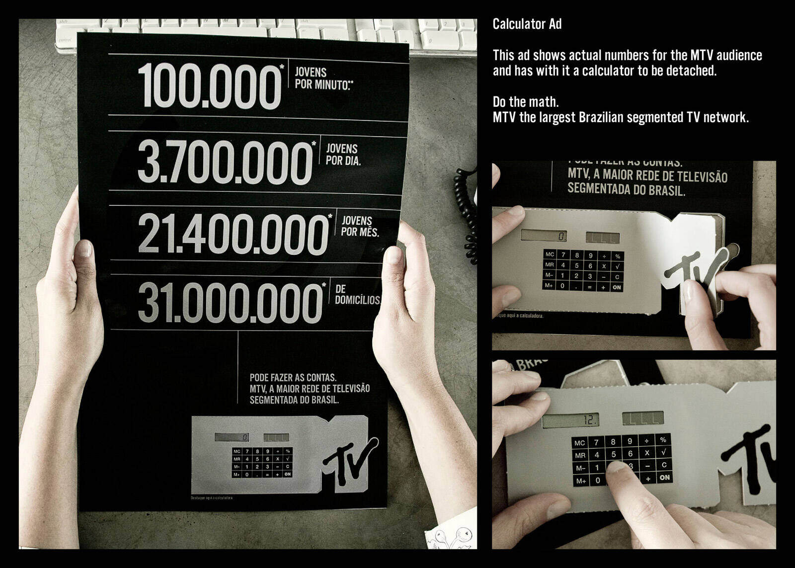 This professional campaign titled 'Calculator' was published in Brazil in April, 2009. It was created for the brand: MTV, by ad agency: Loducca. This Static Images medium campaign is related to the Media industry and contains 1 media asset. It was submitted over 16 years ago.