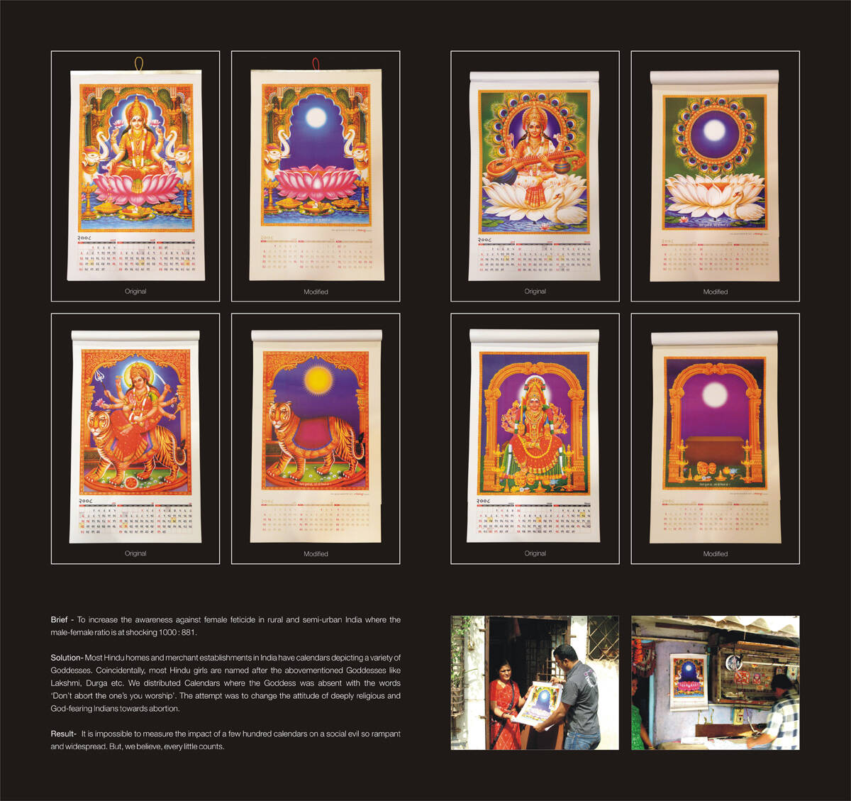 This professional campaign titled 'Calendar' was published in India in January, 2008. It was created for the brand: Campaign against female feticide, by ad agency: Rediffusion DYR. This Ambient medium campaign is related to the Public Interest industry and contains 1 media asset. It was submitted over 17 years ago.