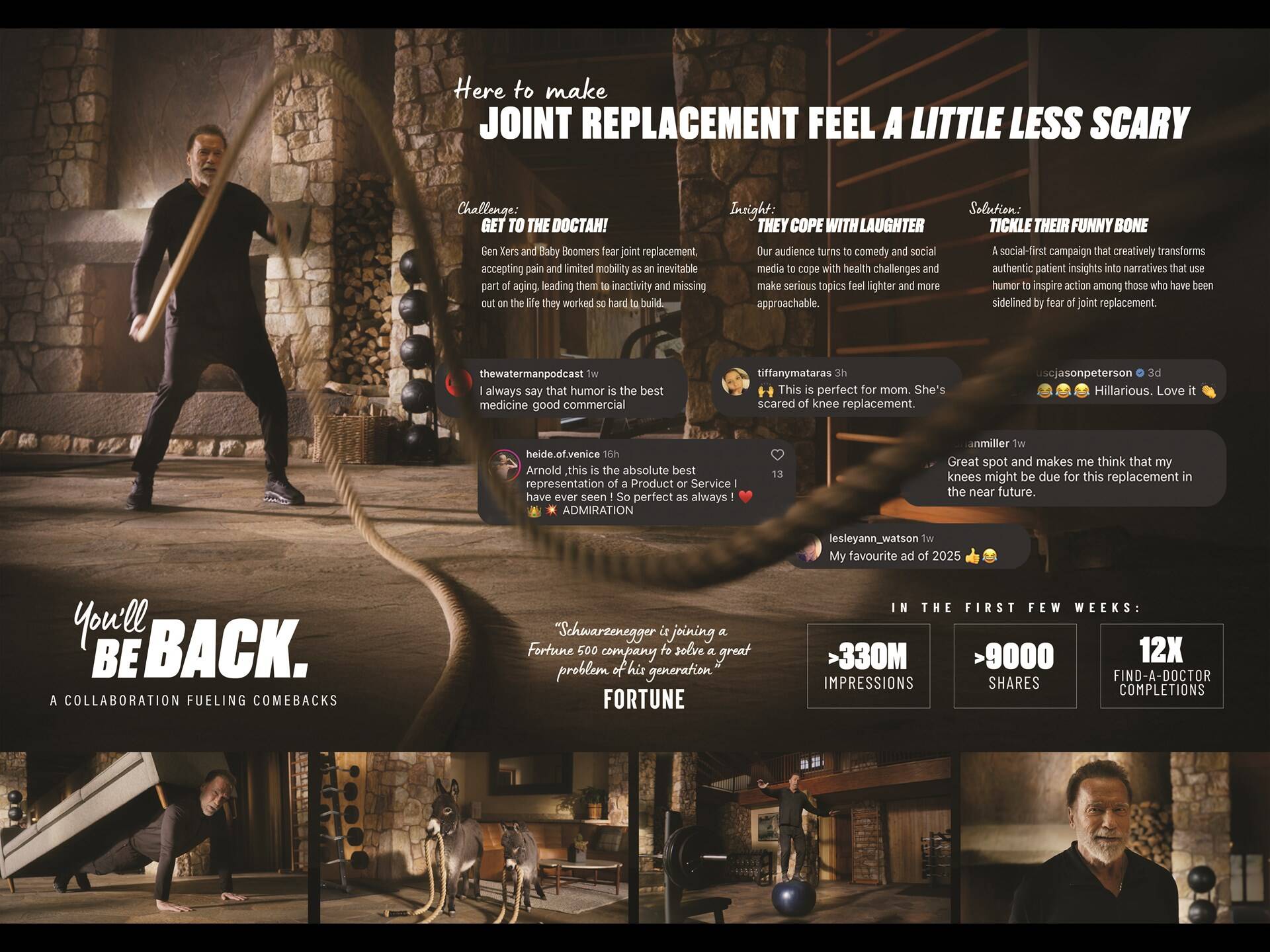 Traditional messaging around joint health tends to be serious and clinical, failing to resonate with a population that increasingly seeks humor and connection online, causing them to remain stagnant and miss out on life. The "You'll Be Back" campaign was designed to disrupt this narrative by transforming the conversation around joint replacement through humor they can not only relate to, but feel inspired by.