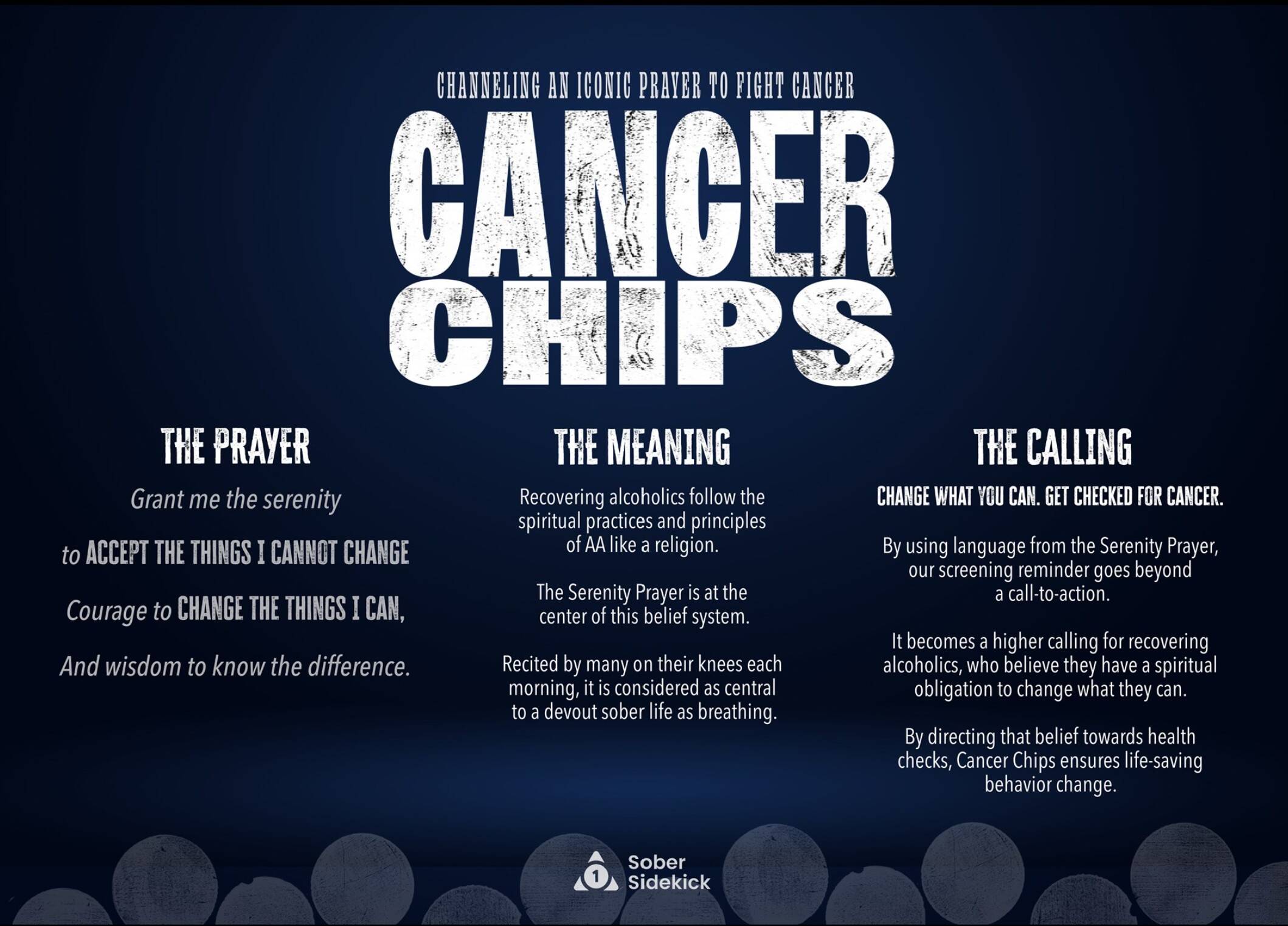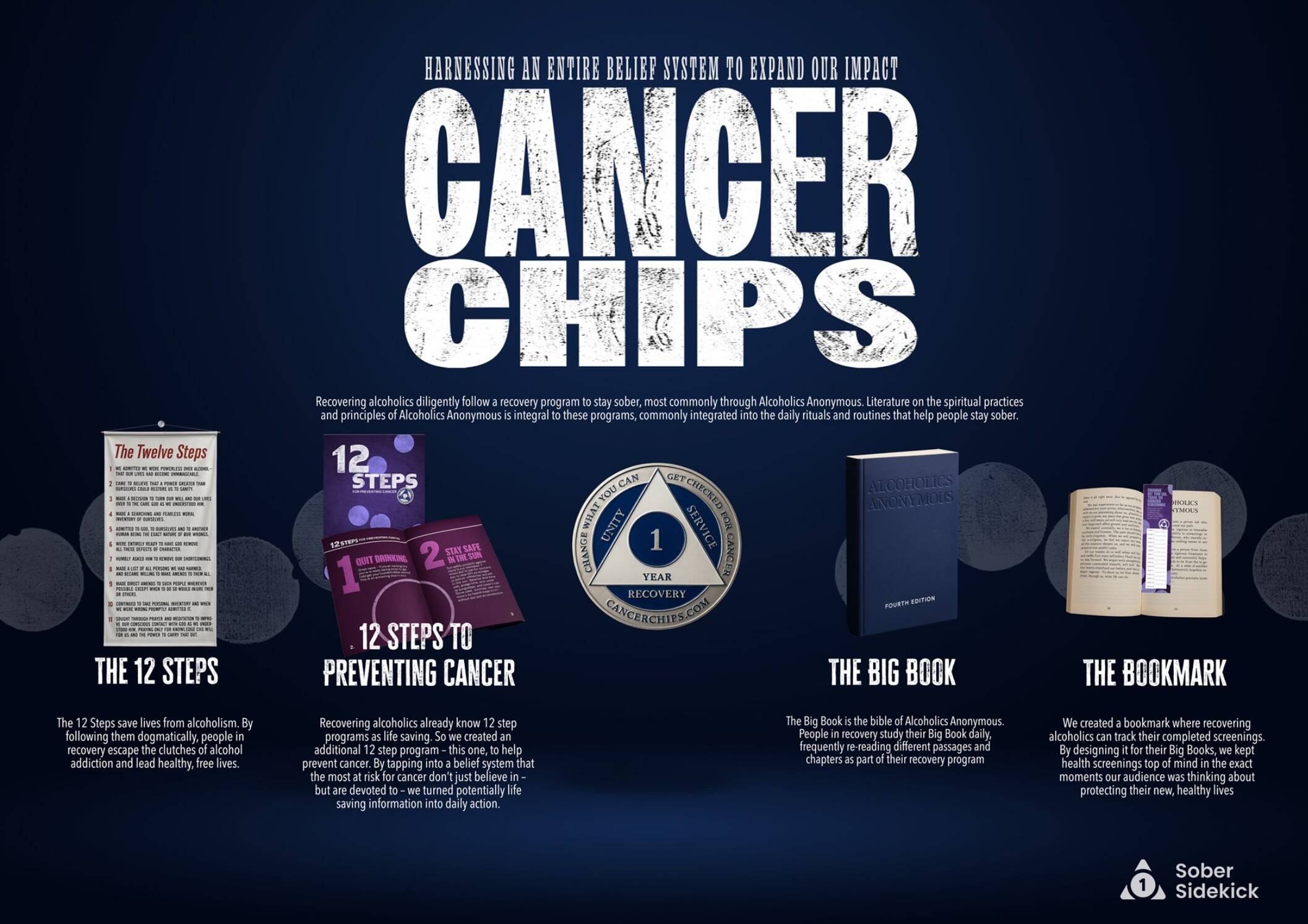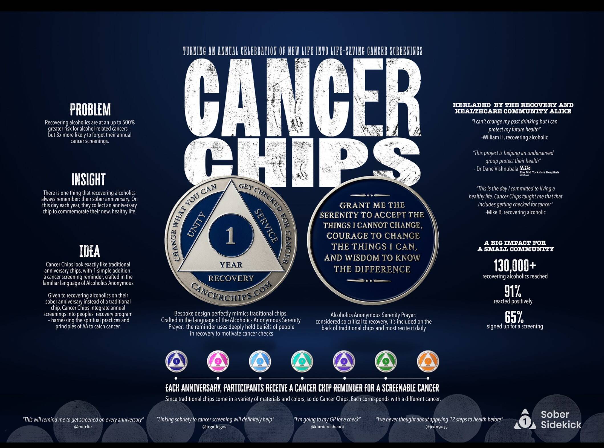 The insight was simple and powerful. While annual cancer screenings are often forgotten, one date in recovery is never missed: a person’s sobriety anniversary. Cancer Chips were created to fit seamlessly into this ritual. Designed to look like traditional AA anniversary chips, they include a discreet cancer screening reminder written in the familiar language of recovery, placing health action directly into the hands of those most at risk at a moment when healthy living is top of mind.