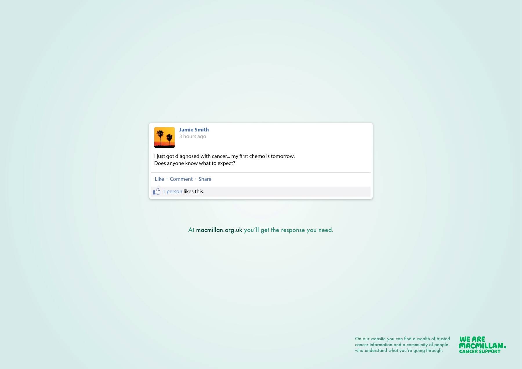 This professional campaign titled 'Cancer Support' was published in United States in July, 2013. It was created for the brand: MacMillan, . This Print medium campaign is related to the Public Interest industry and contains 1 media asset. It was submitted over 12 years ago.