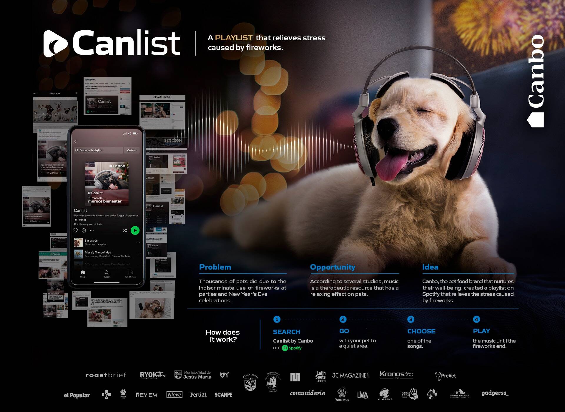 This professional campaign titled 'Canlist ' was published in Peru in December, 2022. It was created for the brand: Canbo, by ad agency: Pasaporte Studio. This Audio and Digital media campaign is related to the Food and Pets industries and contains 1 media asset. It was submitted almost 3 years ago.